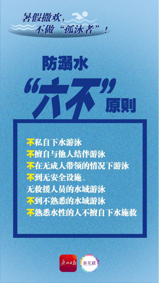 不要独自下水游泳,不到不熟悉、无安全设施、无救援人员的水域游泳;不要擅自下水施救;不要花式入水,防止呛水窒息;不要在水中吃东西,避免被呛;不要在水中嬉戏打闹。