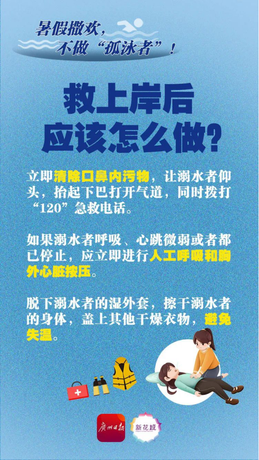 1.上岸后立即检查是否有呼吸与心跳,清除口中的淤泥与杂草;2.如果没有呼吸与心跳,先进行5次的口对口人工呼吸;3.然后进行胸外按压30次;4.之后按照人工呼吸2次、胸外按压30次的比例循环;5.尽快连接AED依照提示操作;6.如果有呼吸心跳,让溺水者侧身,便于呕吐,及时清除呕吐物。更多防溺水知识一图带你读懂↓ ↓ ↓