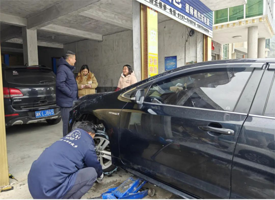 工作人员帮助飞仙岩滞留人员车辆安装防滑链,并安全护送至龙田镇