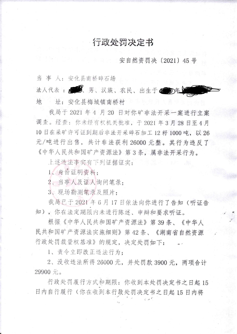 行政处罚决定书(梅城镇南桥碎石场)