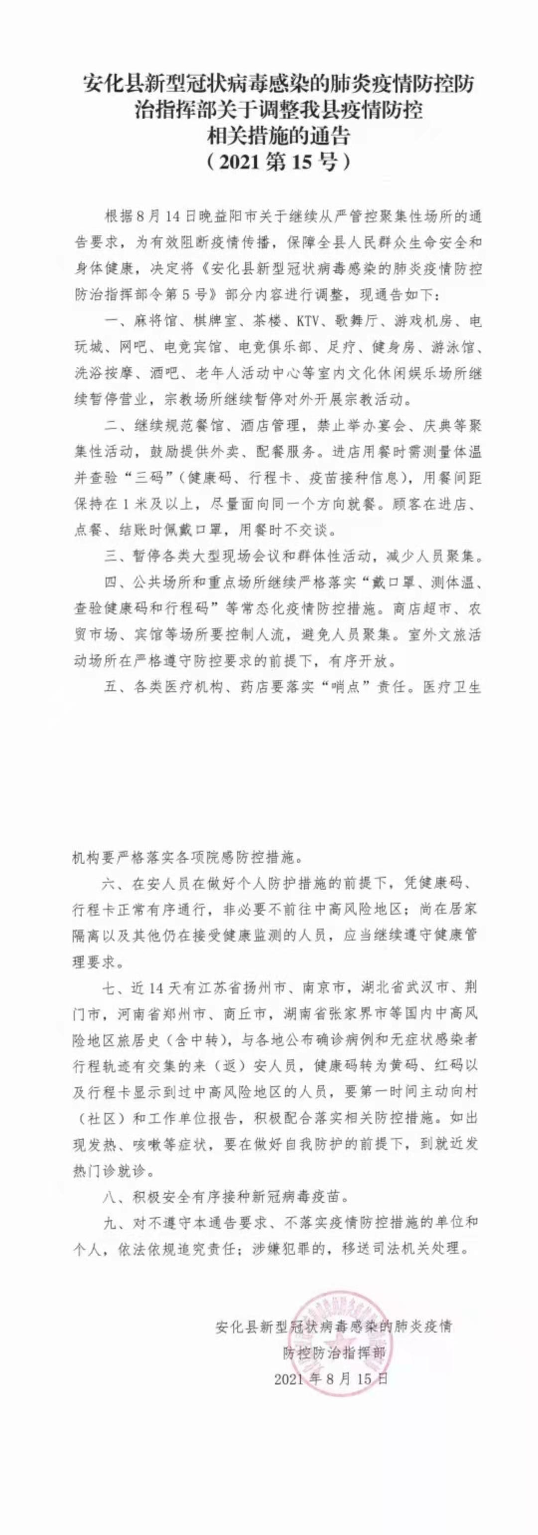 安化县新型冠状病毒感染的肺炎疫情防控防治指挥部关于调整我县疫情防控相关措施的通告