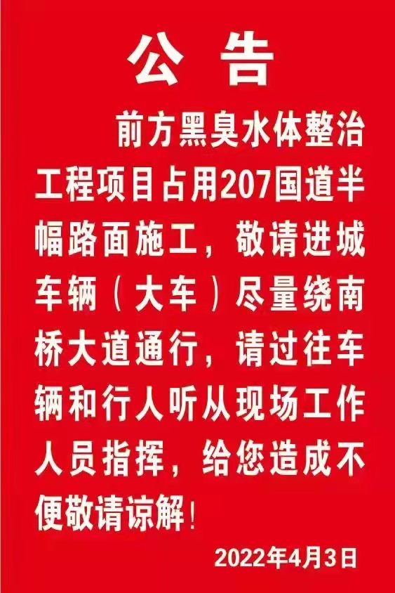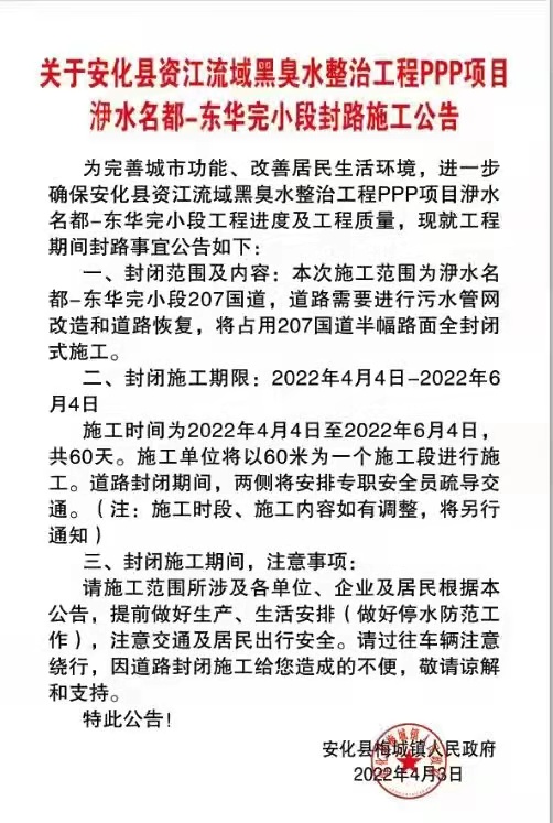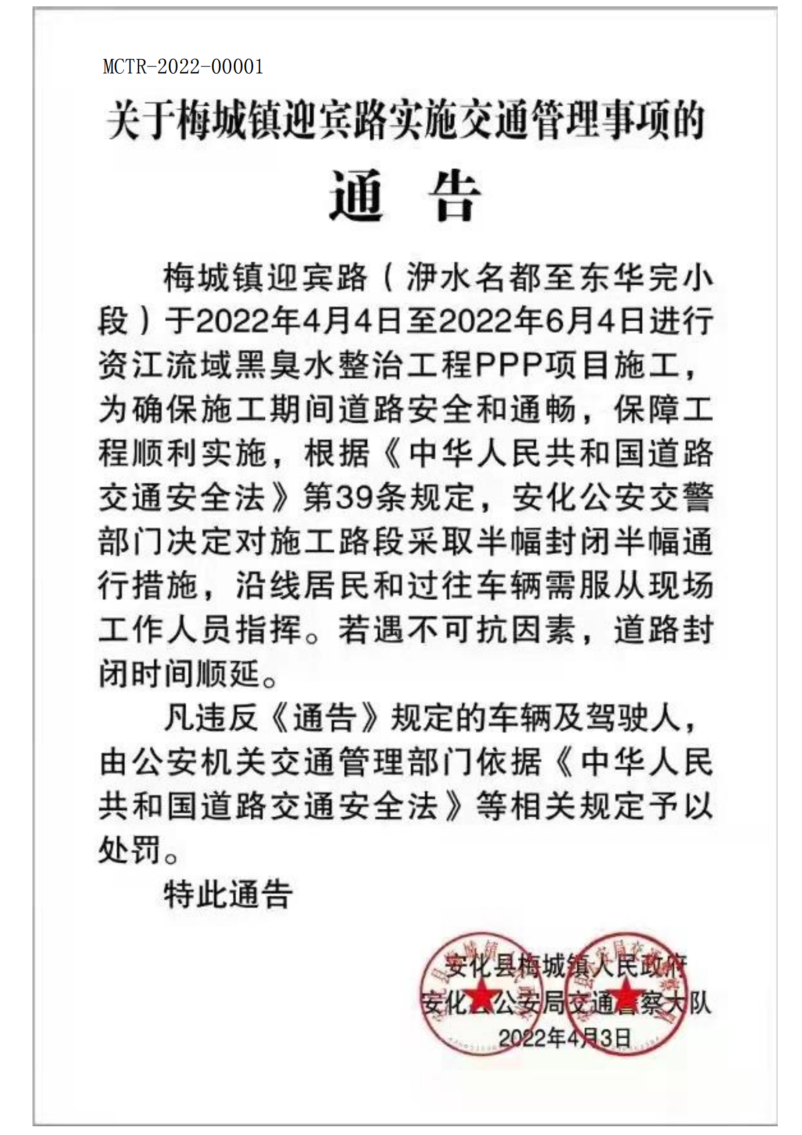 关于对梅城镇迎宾路(洢水名都至东华完小段)封路施工及实施交通管理事项的通告