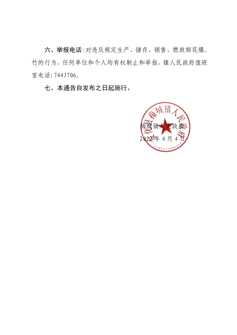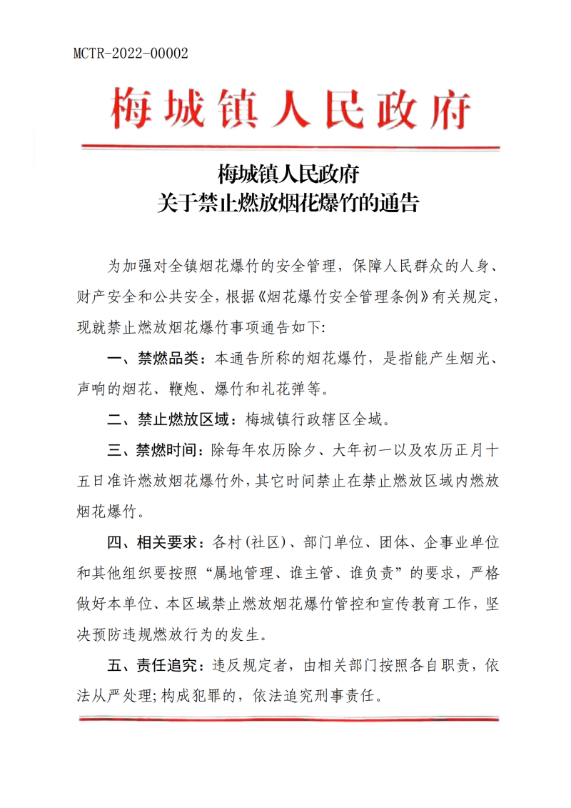 梅城镇人民政府关于禁止燃放烟花爆竹的通告