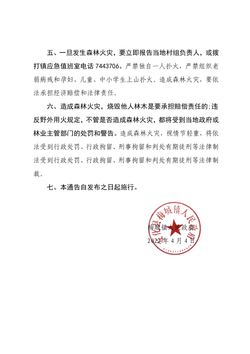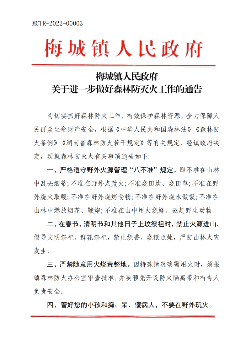 梅城镇人民政府关于进一步做好森林防灭火工作的通告