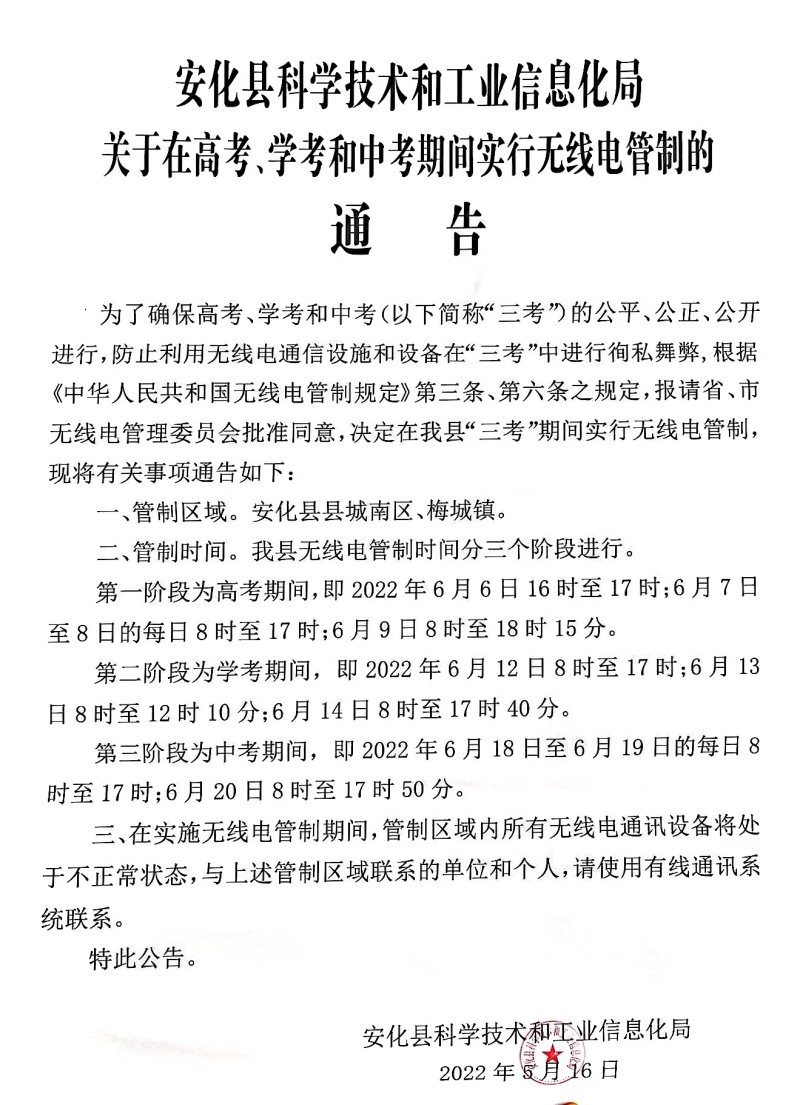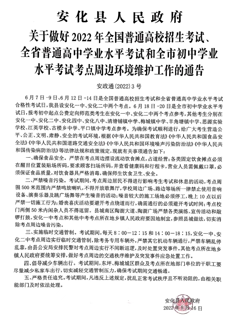 关于做好2022年全国普通高校招生考试、全省普通高中学业水平考试和全市初中学业水平考试考点周边环境维护工作的通告