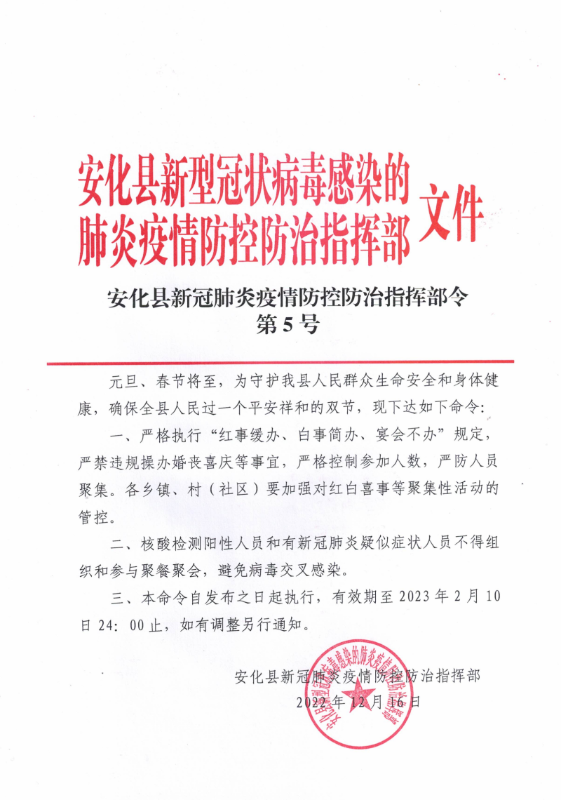 关于转发《安化县新冠肺炎疫情防控防治指挥部令第5号》的通知