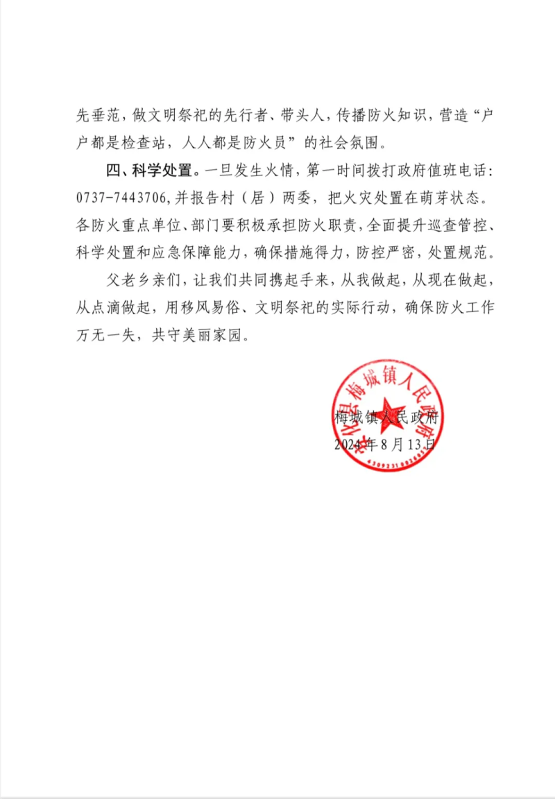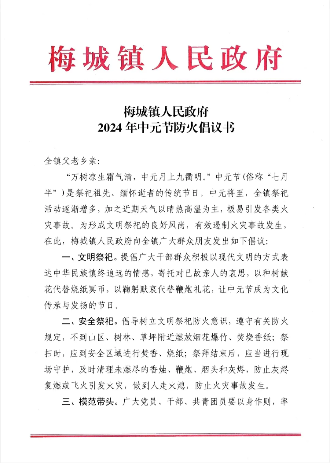 梅城镇2024年中元节防火倡议书