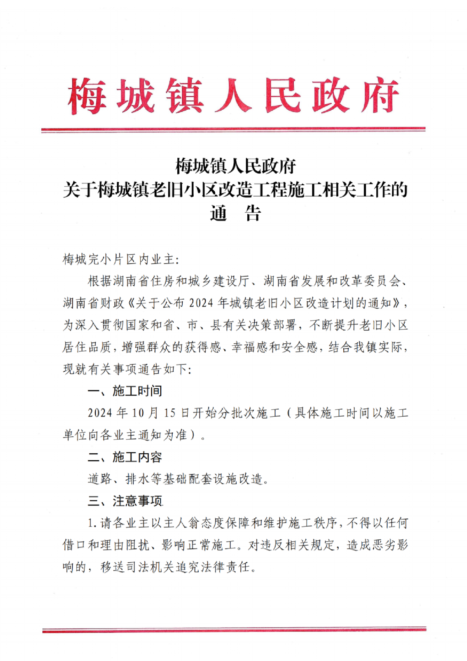 梅城镇人民政府关于梅城镇老旧小区改造工程施工相关工作的通告