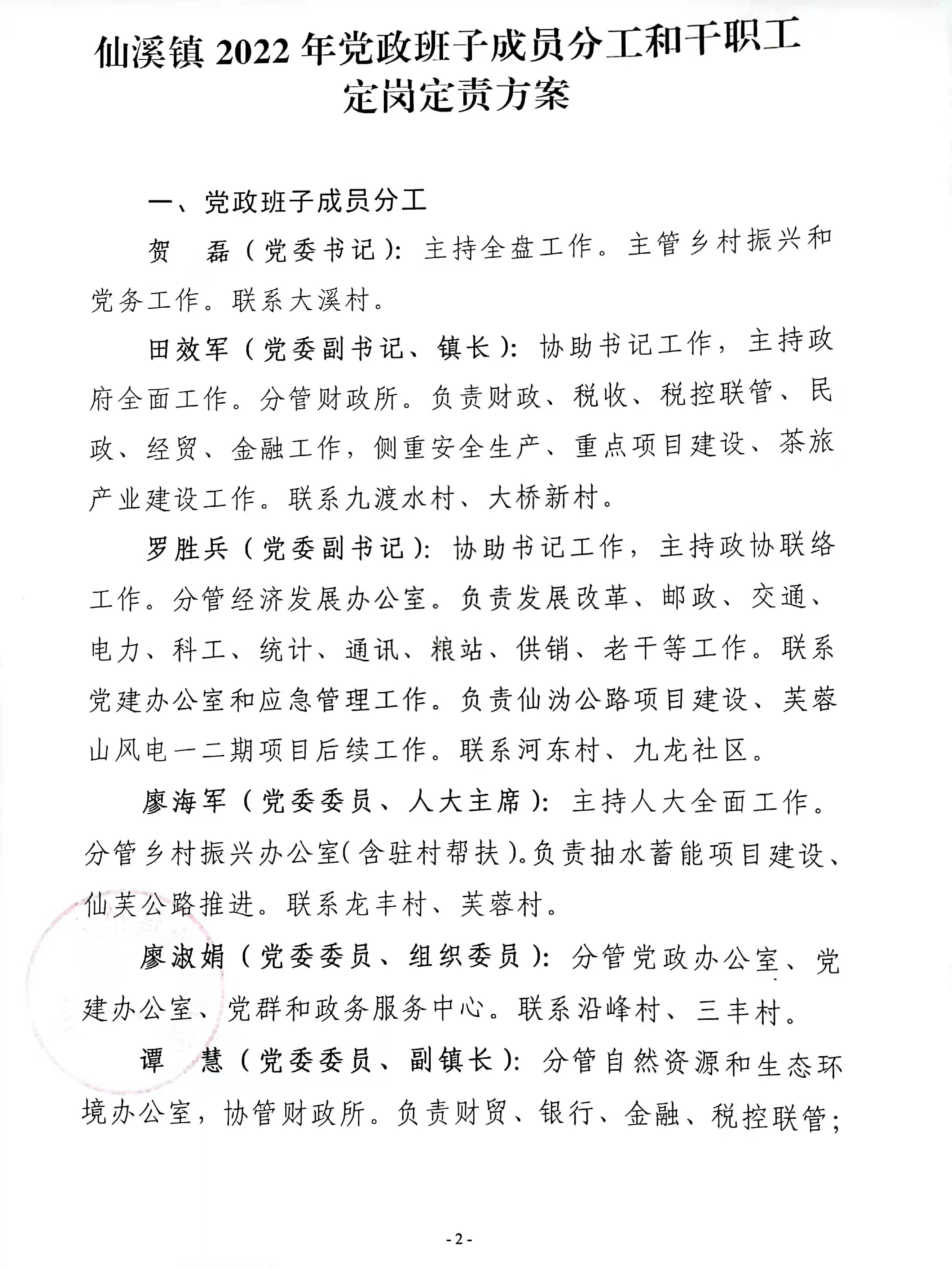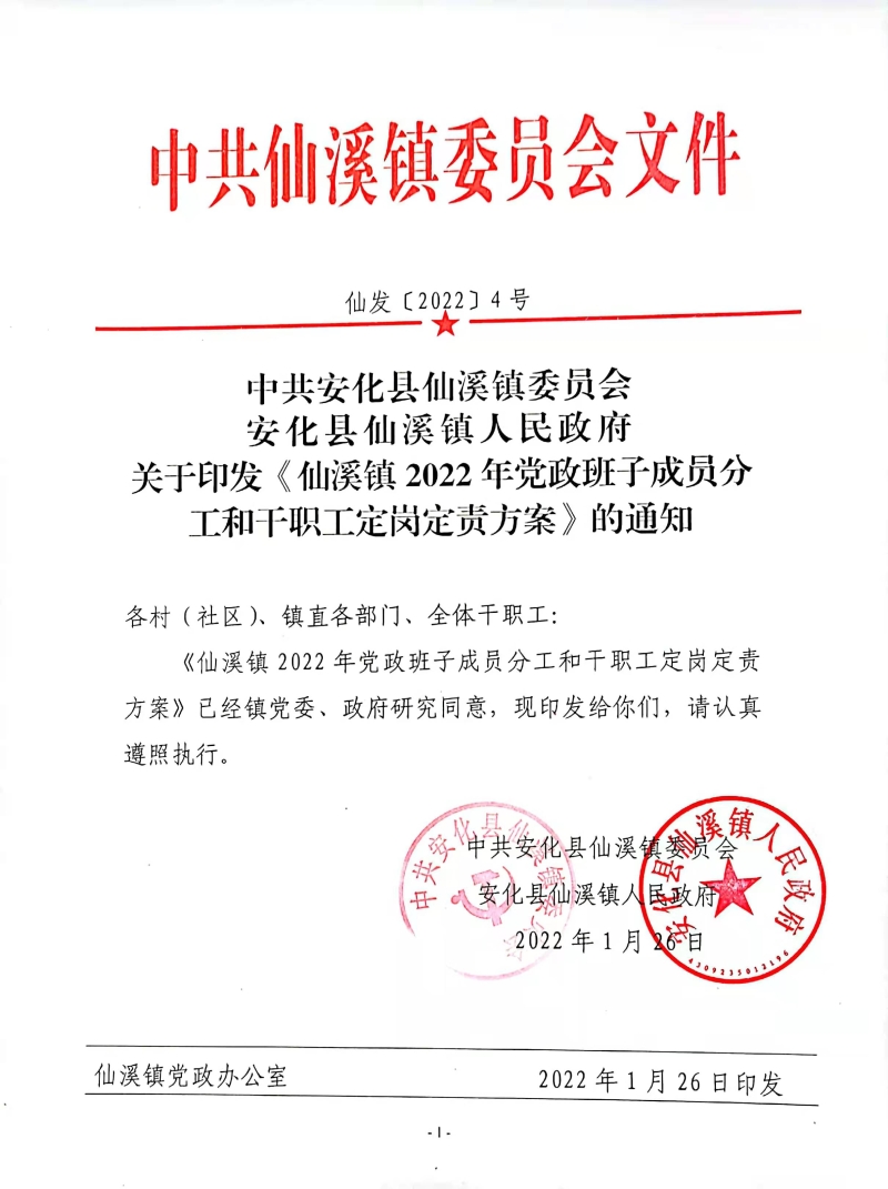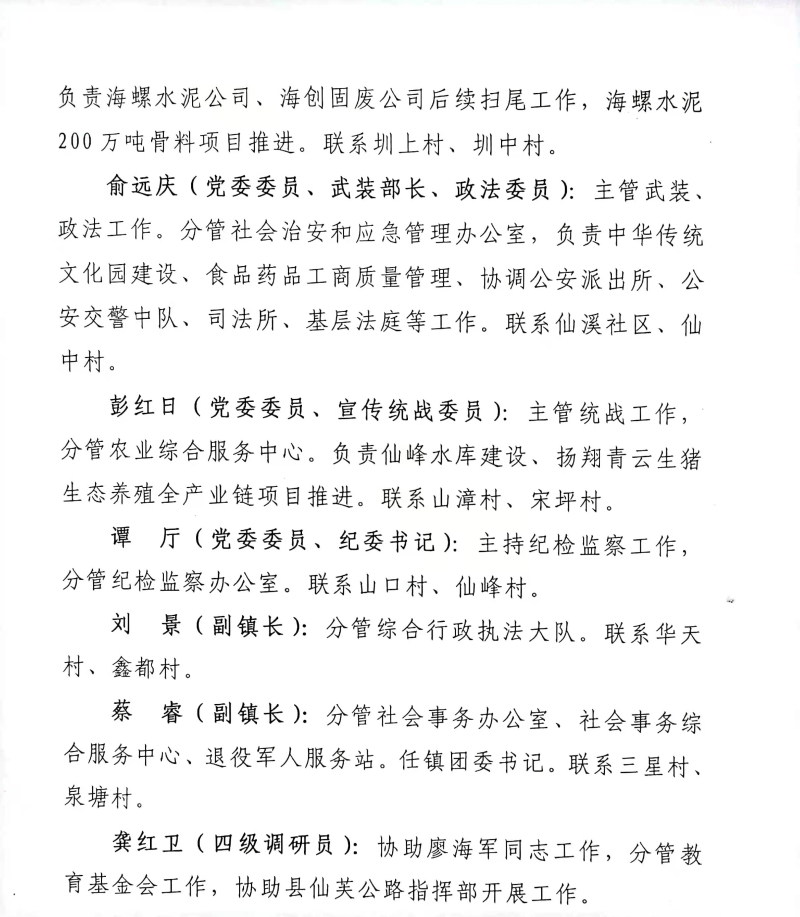 仙溪镇2022年党政领导分工