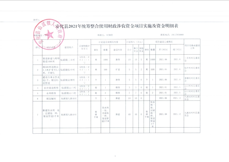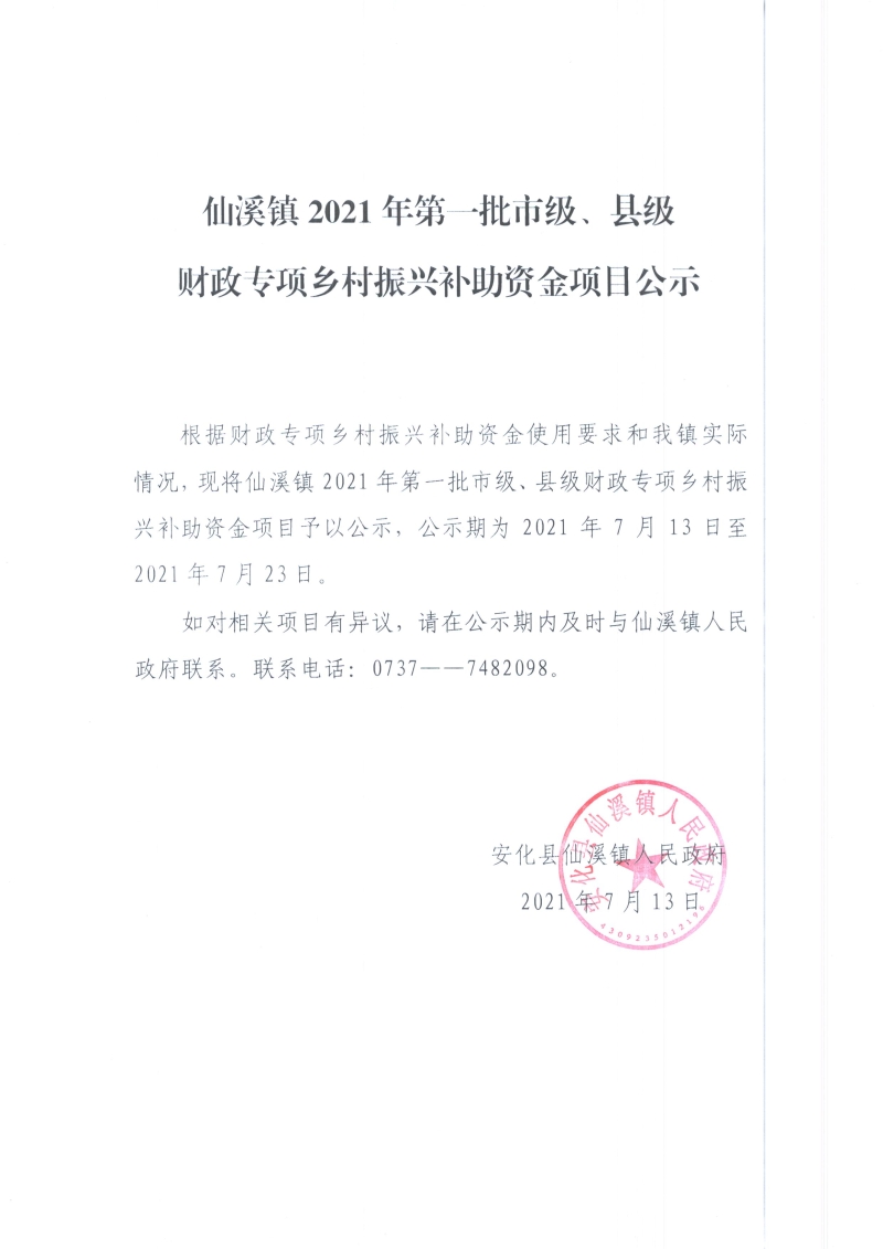 仙溪镇2021年第一批市级、县级财政专项乡村振兴补助资金项目公示