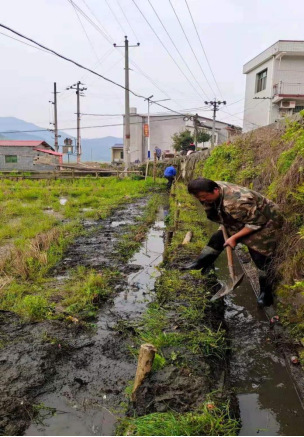 ▲图为村民在疏通渠道确保农田灌溉用水充足