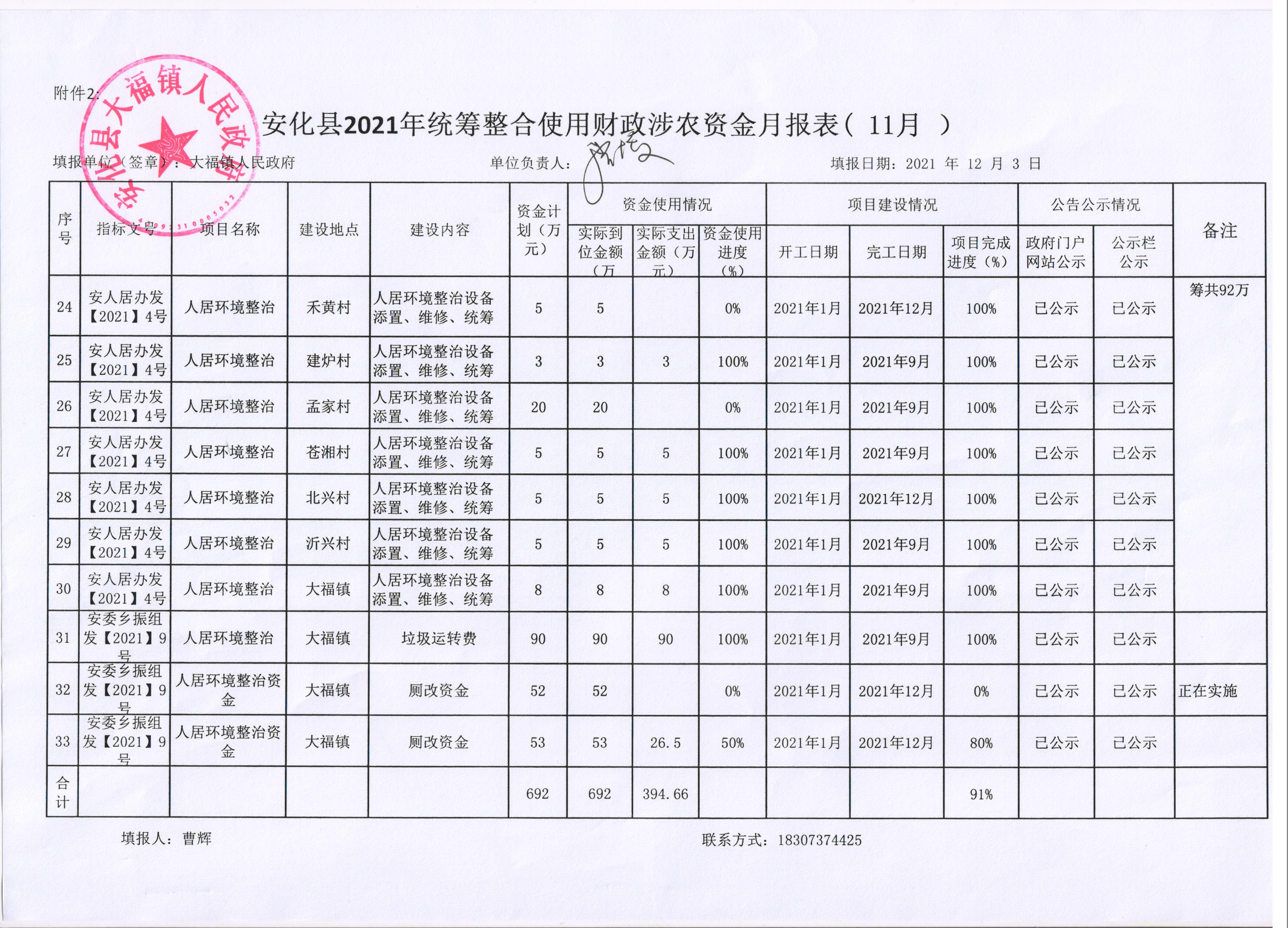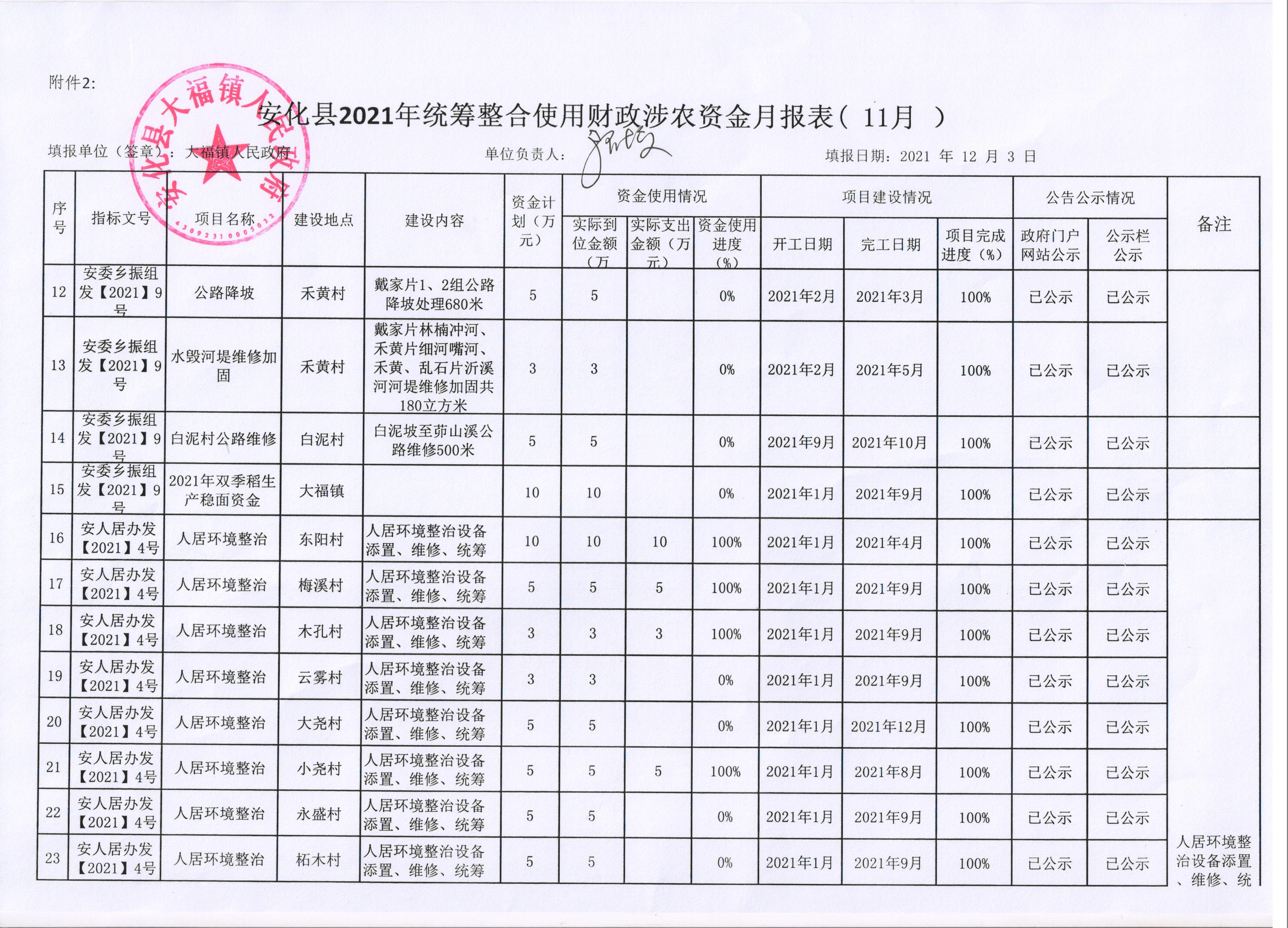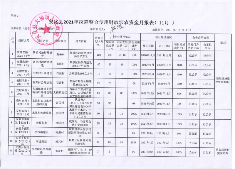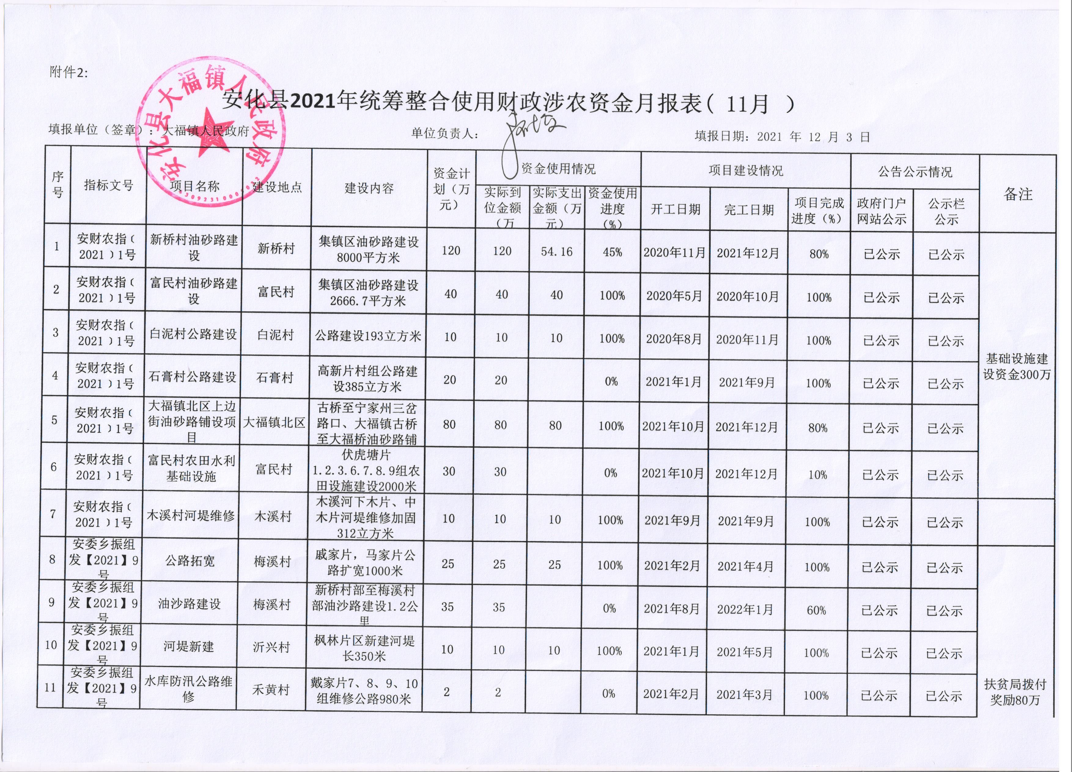 安化县大福镇2021年统筹整合使用财政涉农资金月报表(11月)
