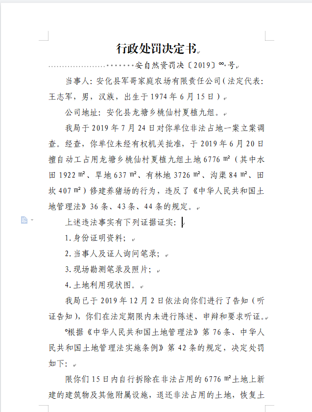 行政处罚决定书(安化县军哥家庭农场有限责任公司)