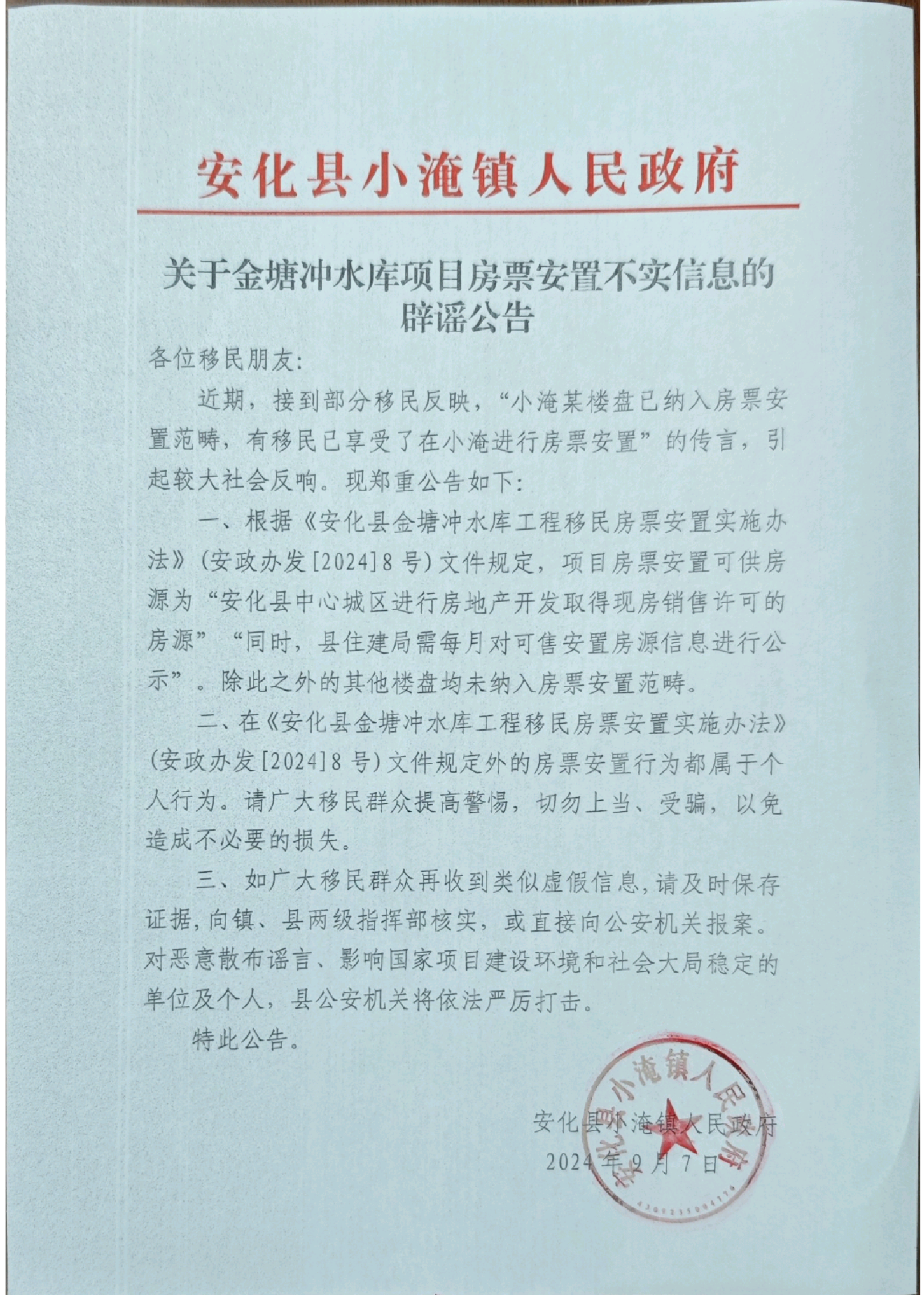 关于金塘冲水库项目房票安置不实信息的辟谣公告