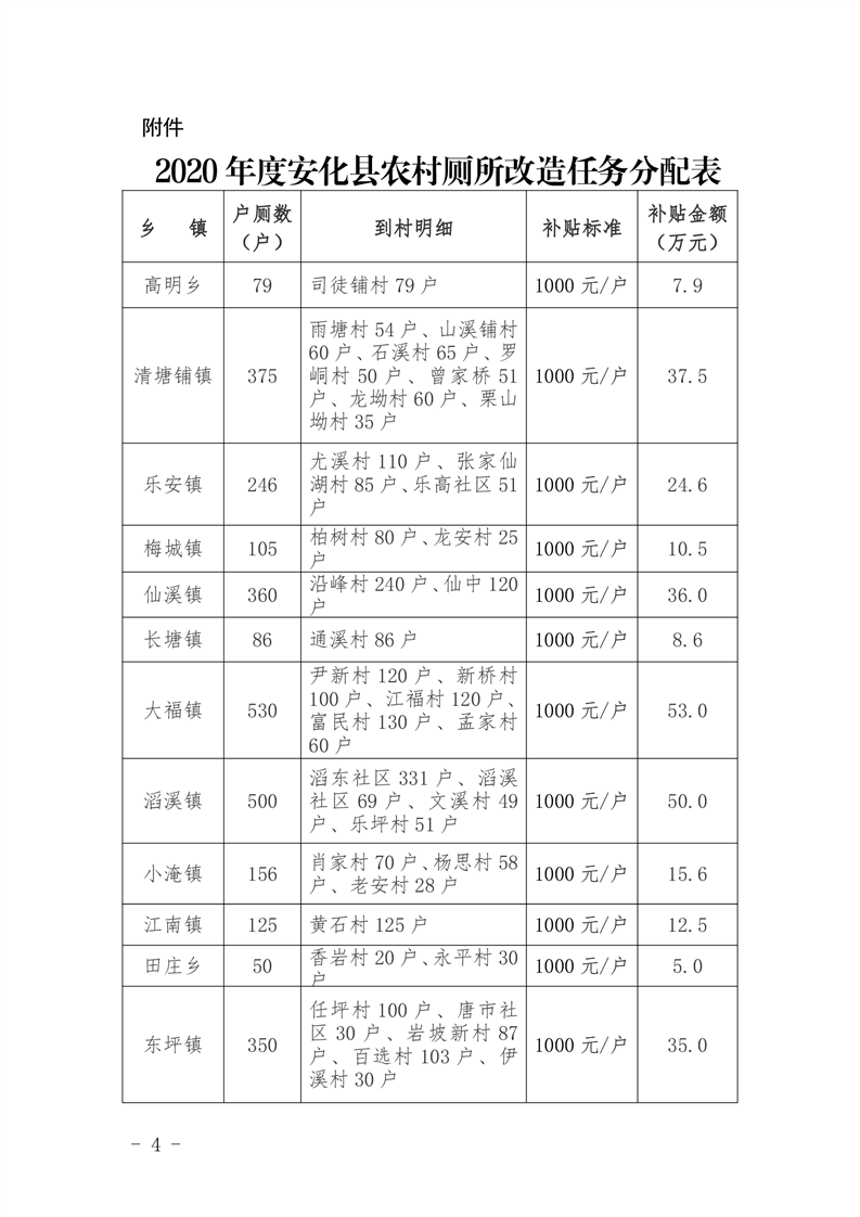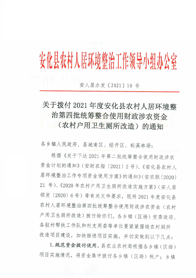 关于拨付2021年度安化县农村人居环境整治第四批统筹整合使用财政涉农资金(农村户用卫生厕所改造)的通知