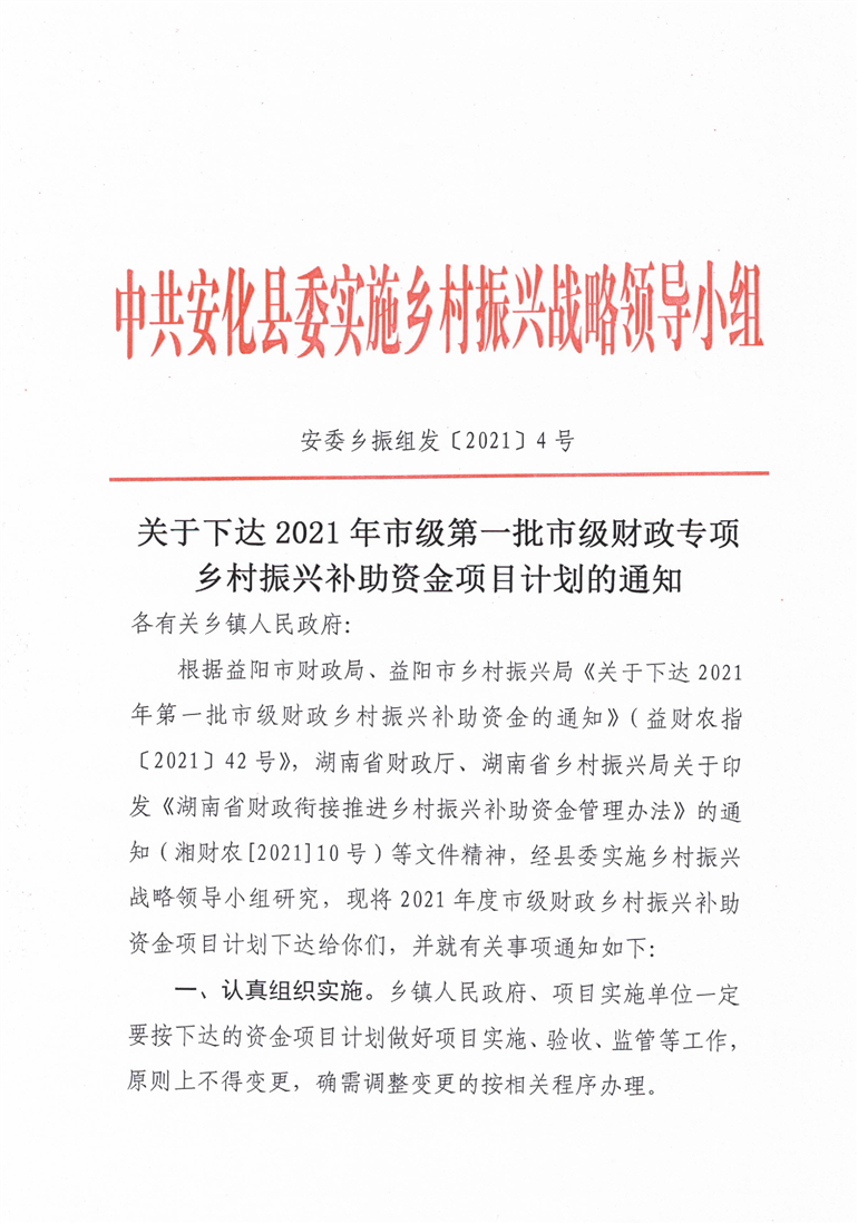 关于下达2021年第一批市级财政专项乡村振兴补助资金项目计划的通知