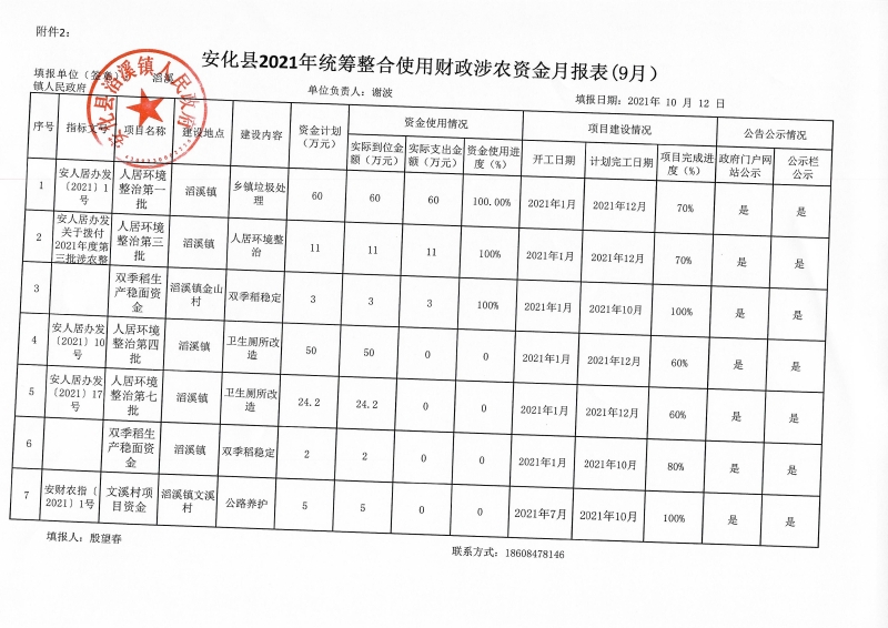 安化县滔溪镇2021年统筹整合使用财政涉农资金月报表(9月)