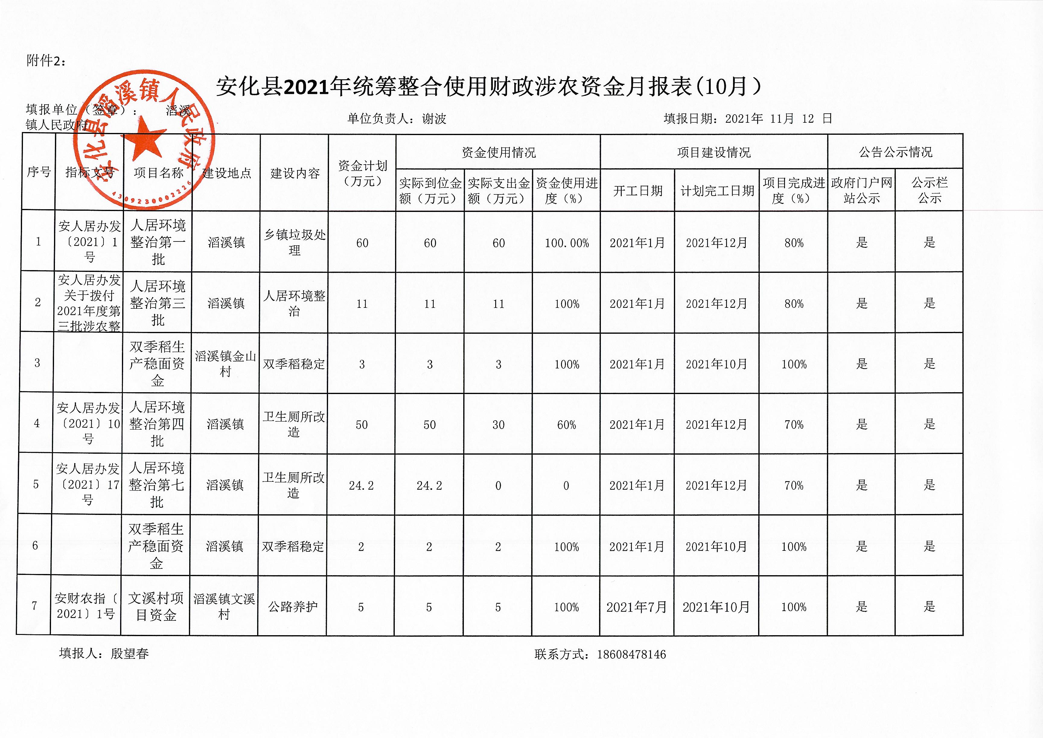 安化县滔溪镇2021年统筹整合使用财政涉农资金月报表(10月)
