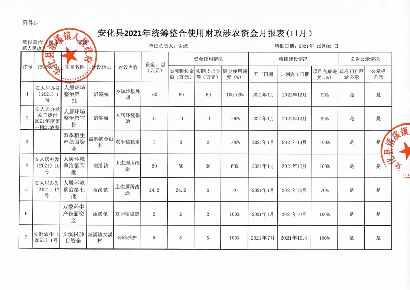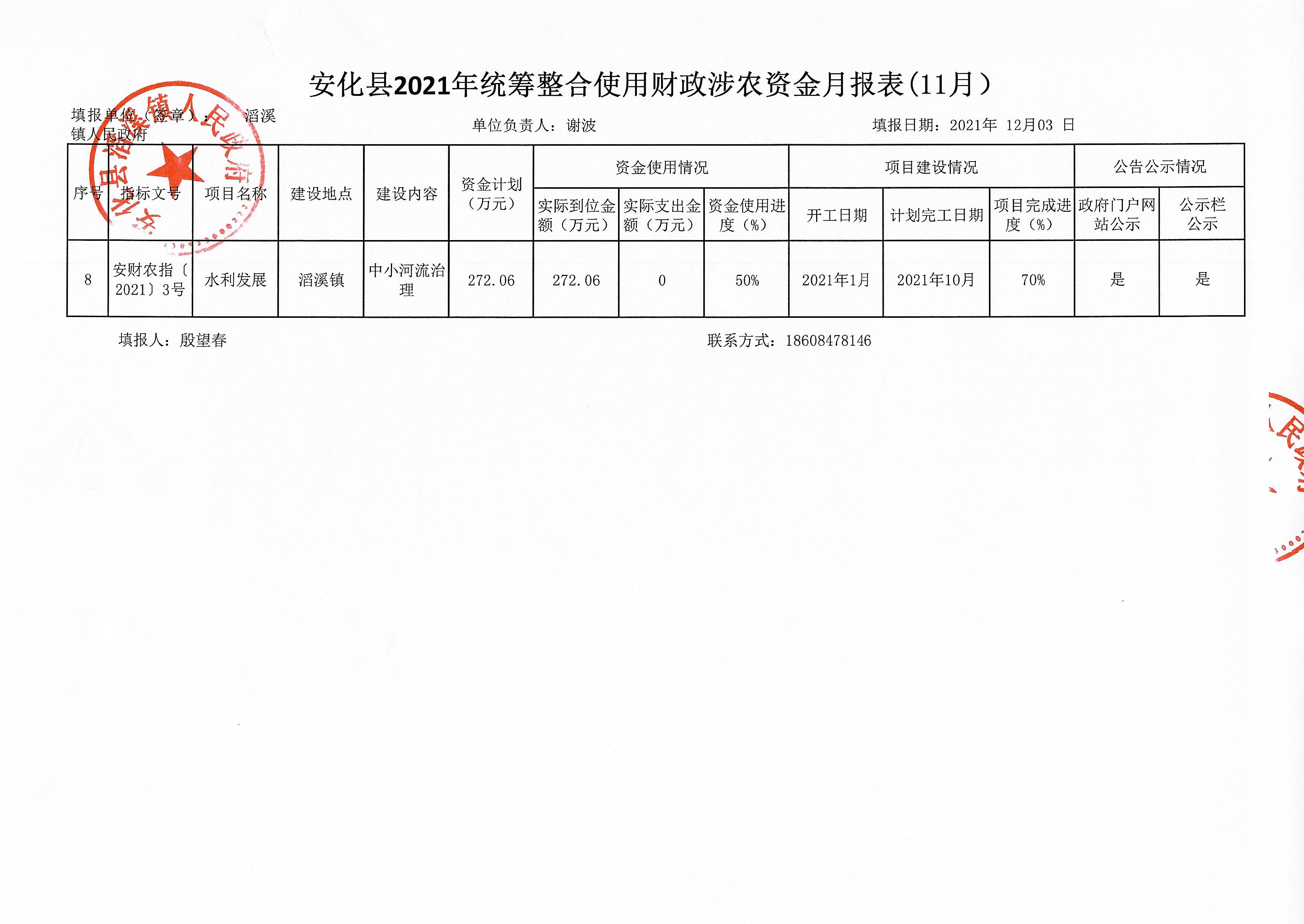 安化县滔溪镇2021年统筹整合使用财政涉农资金月报表(11月)