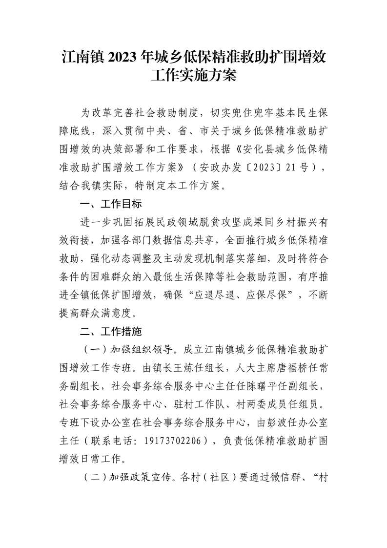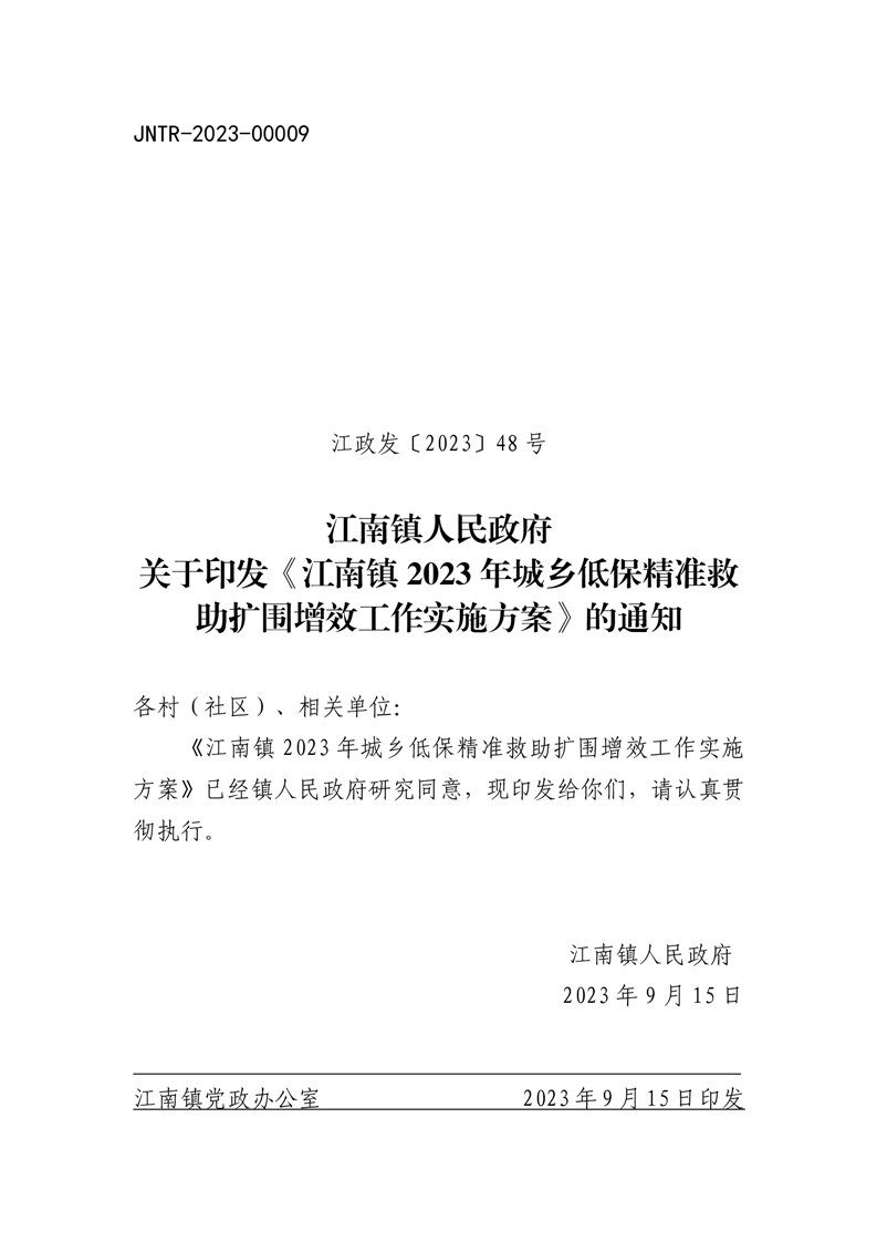 江政发〔2023〕48号关于印发《江南镇2023年城乡低保精准救助扩围增效工作实施方案》的通知