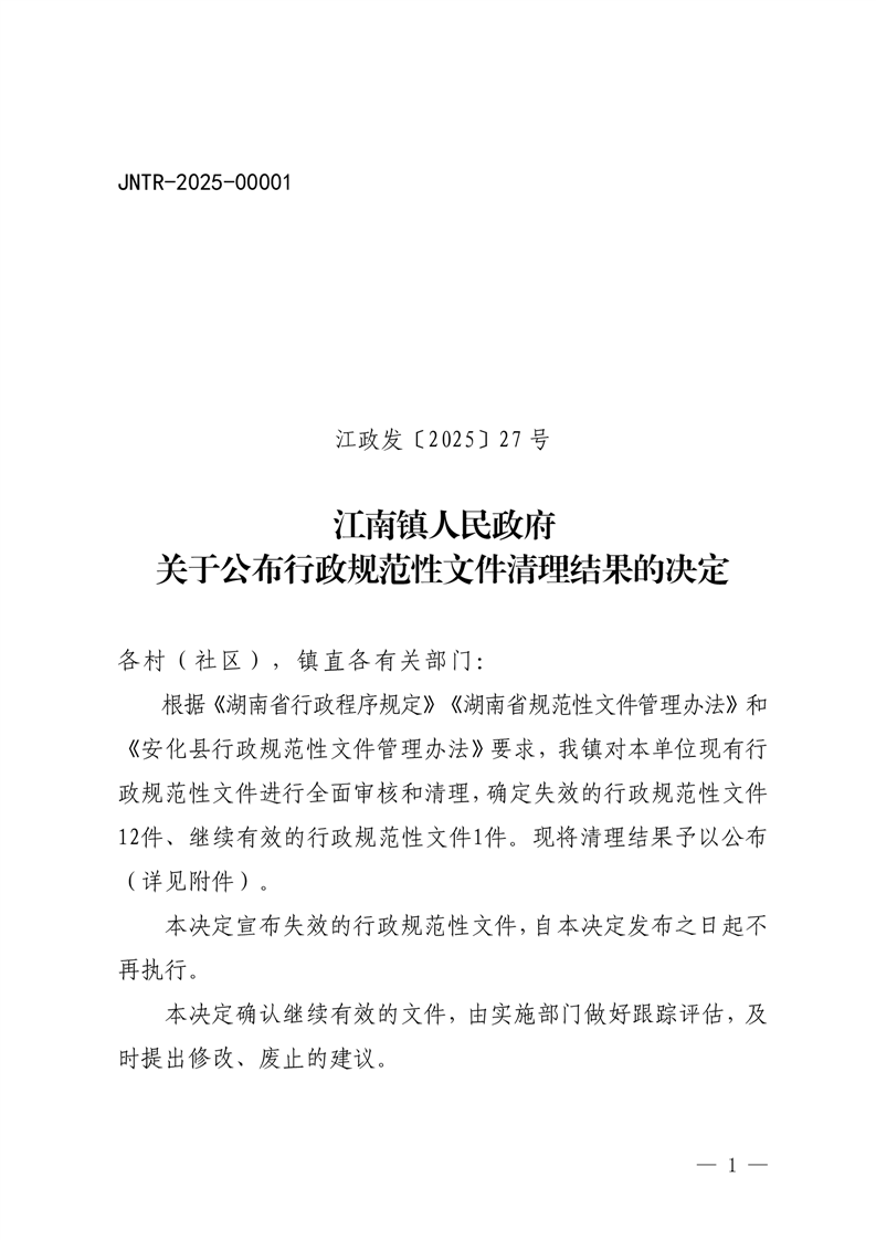 江政发〔2025〕27号关于公布行政规范性文件清理结果的决定