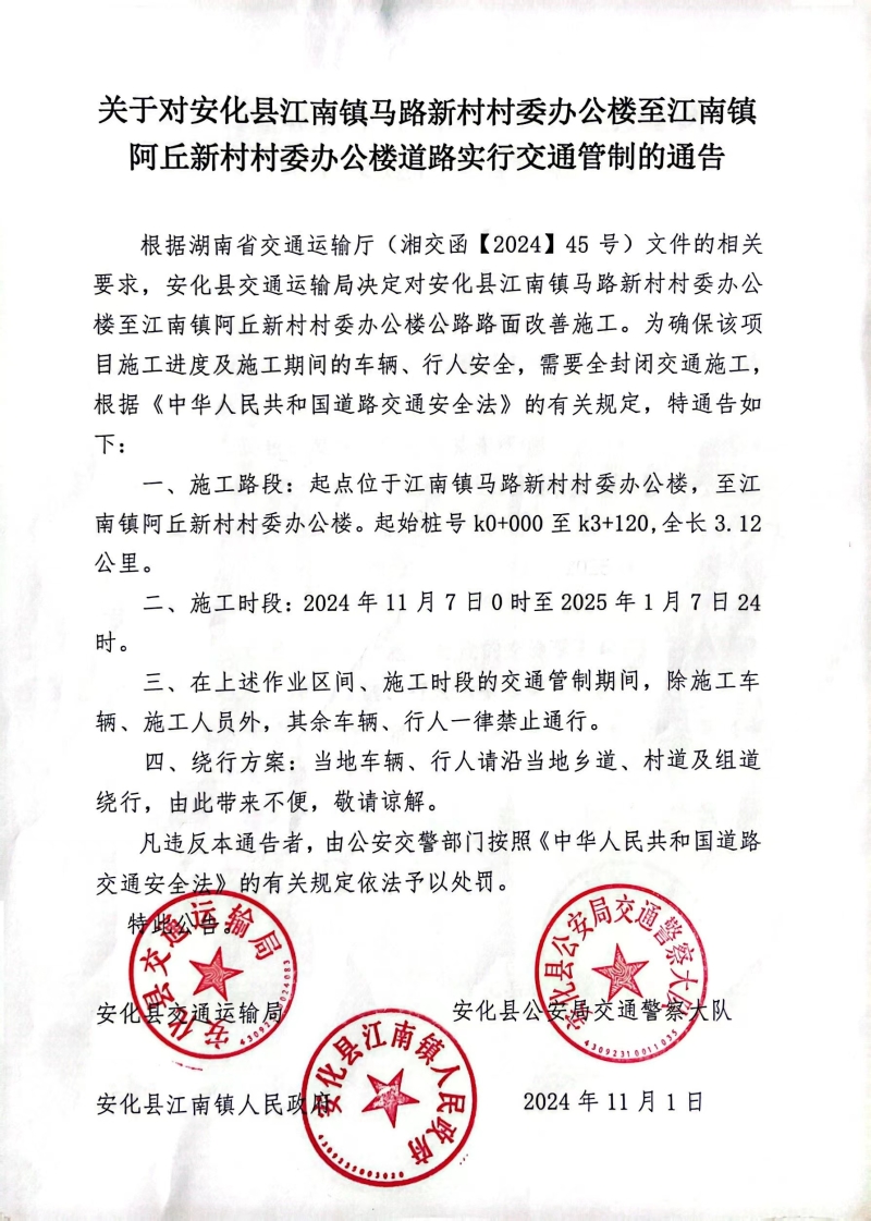 关于对安化县江南镇马路新村村委办公楼至江南镇阿丘新村村委办公楼道路实行交通管制的通告