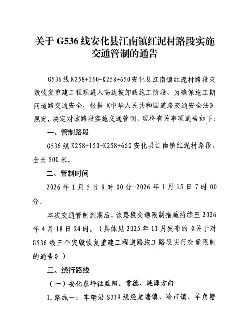 关于G536线安化县江南镇红泥村路段实施交通管制的通告