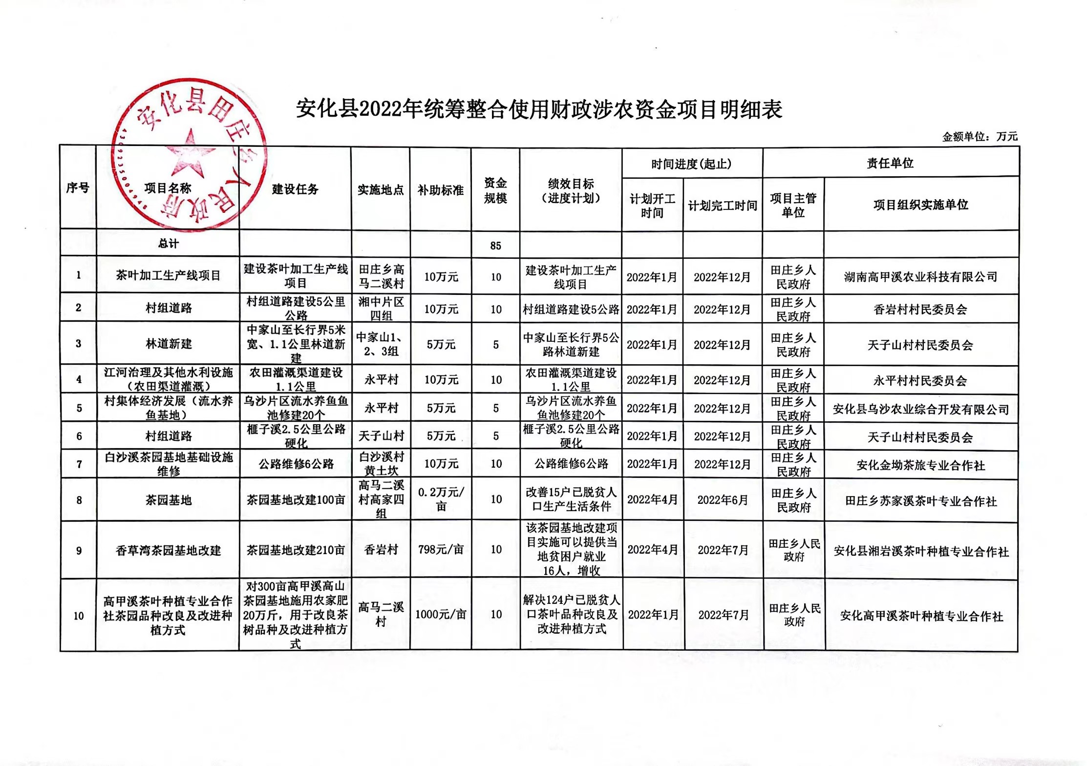 安化县田庄乡2022年度统筹整合使用财政涉农资金项目明细表公示