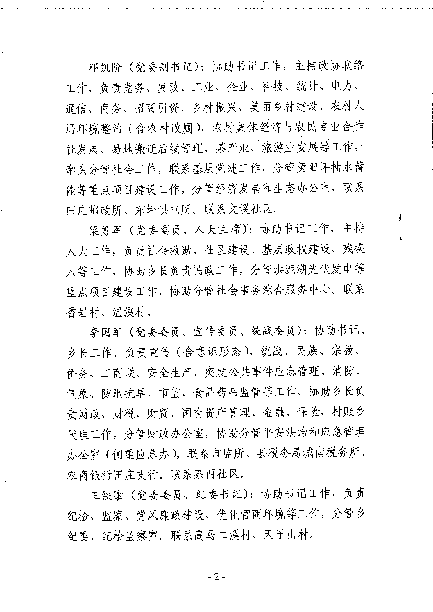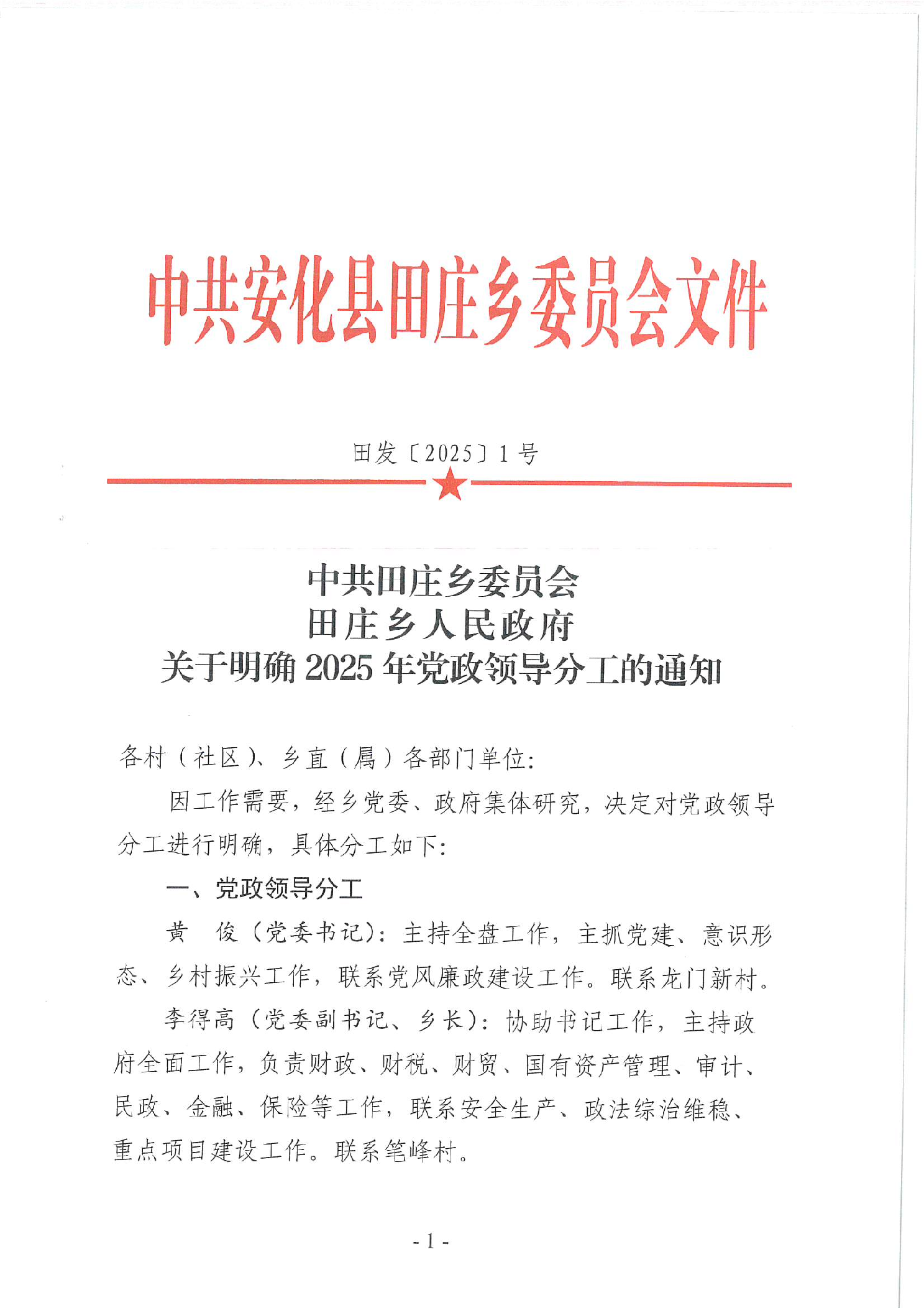 田庄乡2025年党政领导分工