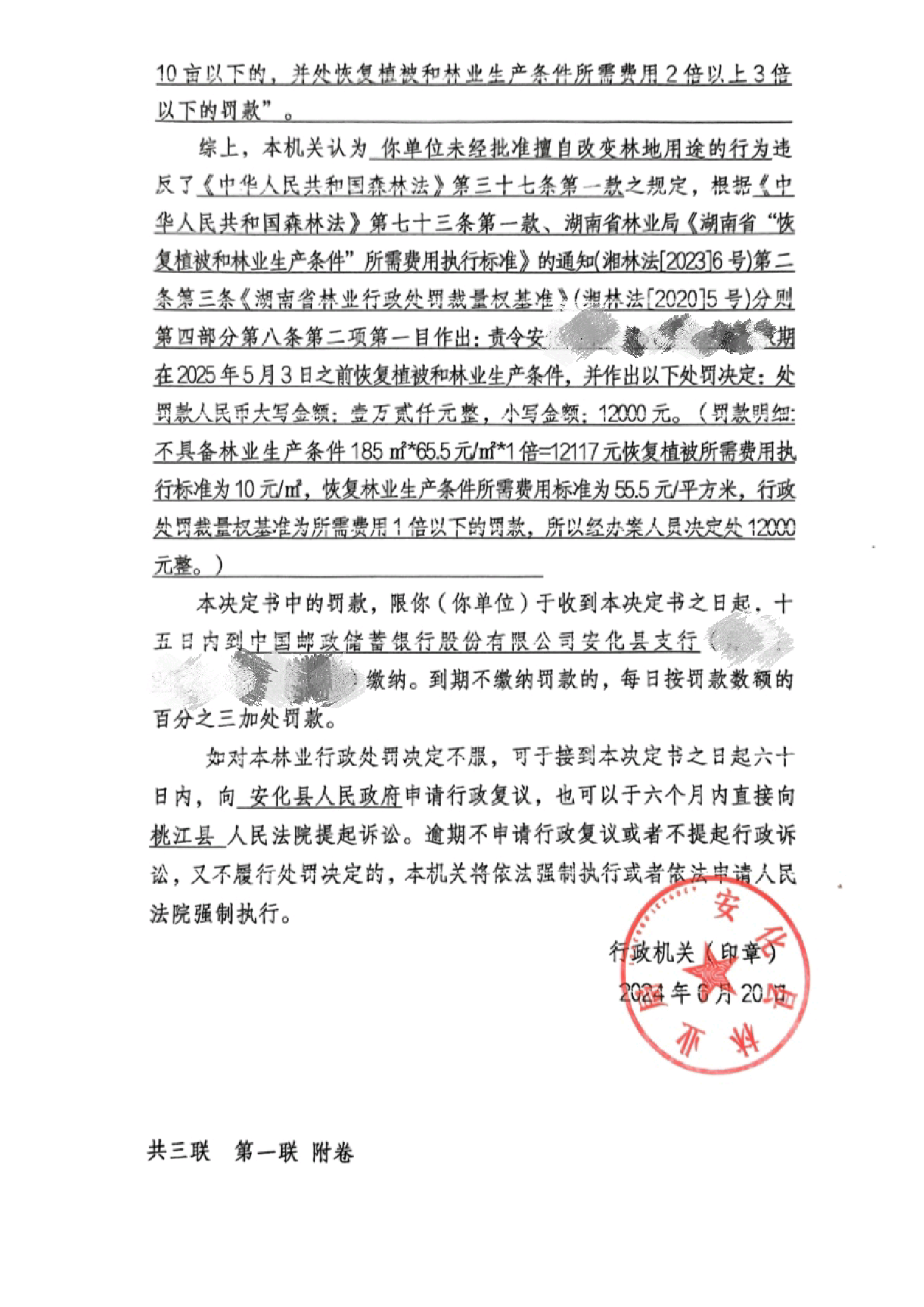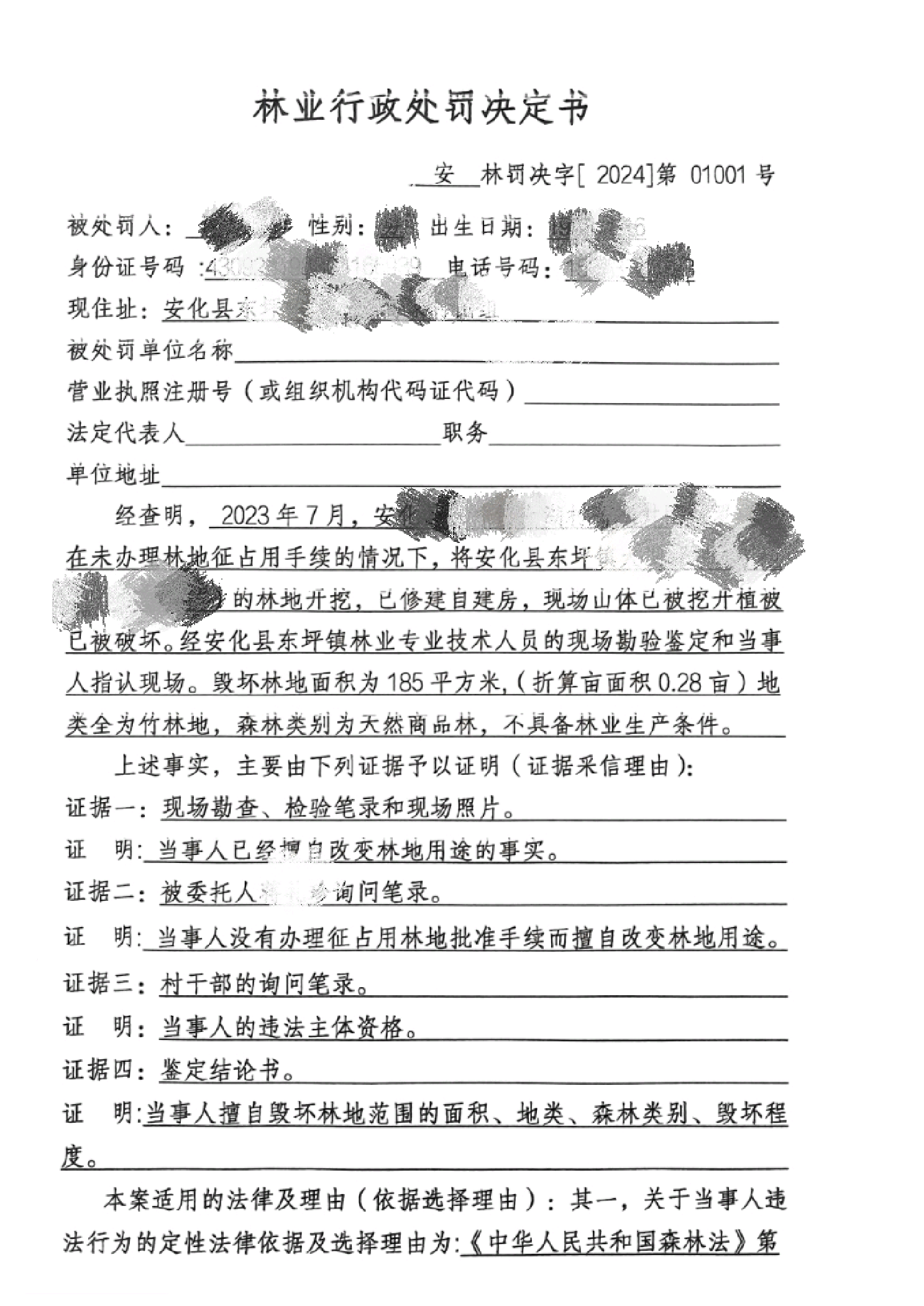 林业行政处罚决定书(安林罚决字【2024】第01001号)