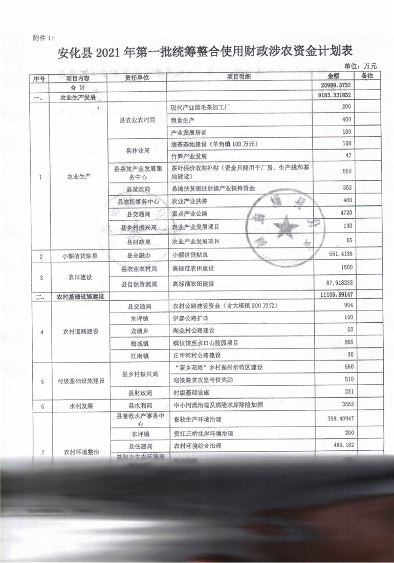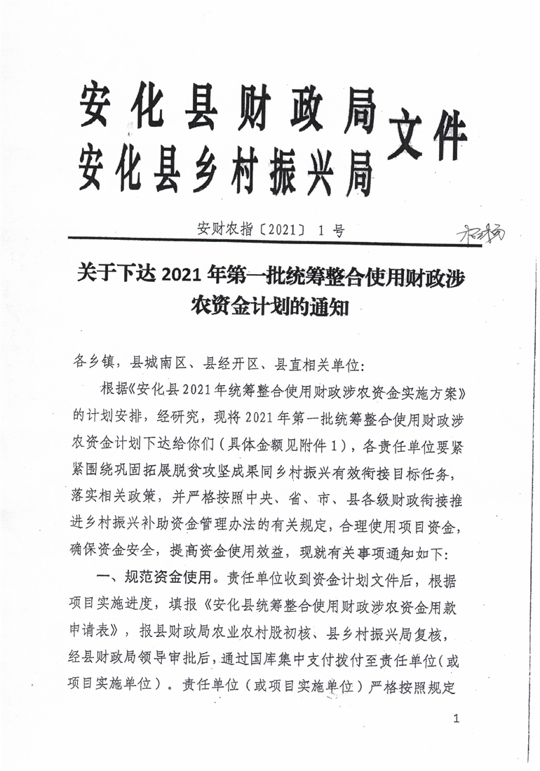 关于下达2021年第一批统筹整合使用财政涉农资金计划的通知