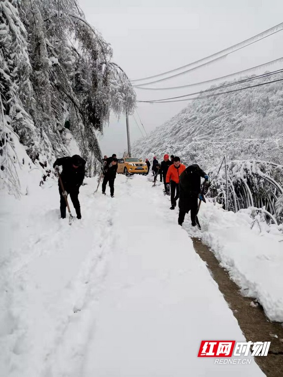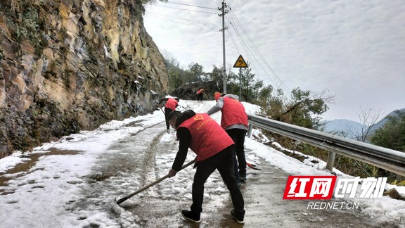 安化县柘溪镇椒园村村支两委和志愿们趁着睛天铲雪。