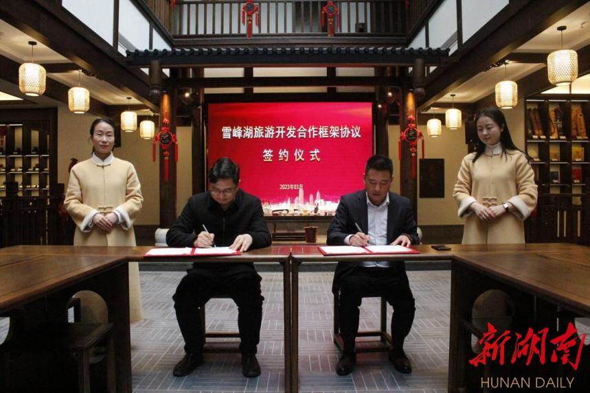 新湖南客户端3月17日讯(通讯员 廖妮婷)3月16日,益阳市安化县柘溪镇人民政府与县梅山城投集团有限公司在安化黑茶馆举行雪峰湖旅游开发框架协议签约仪式。柘溪镇党委书记刘超群,党委副书记、镇长姚志财,县梅山城投公司副总经理曹胜祥及相关负责人出席。