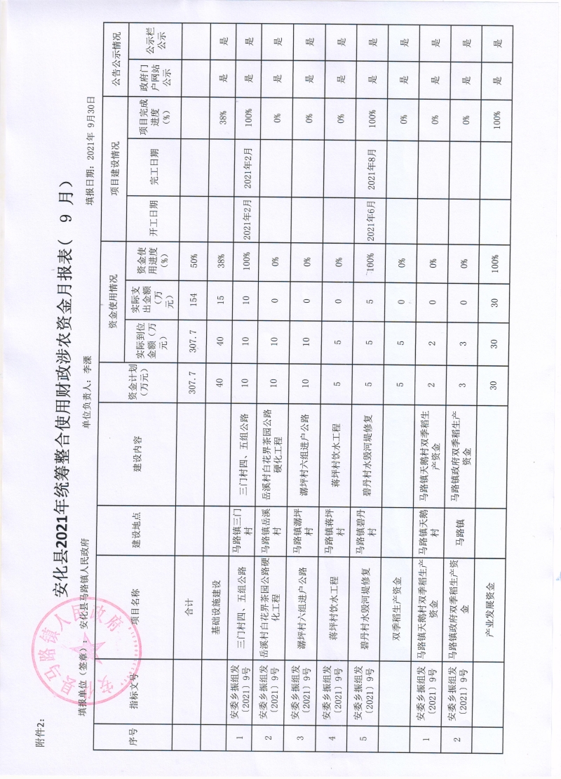 2021年9月马路镇统筹整合使用财政涉农资金进度表