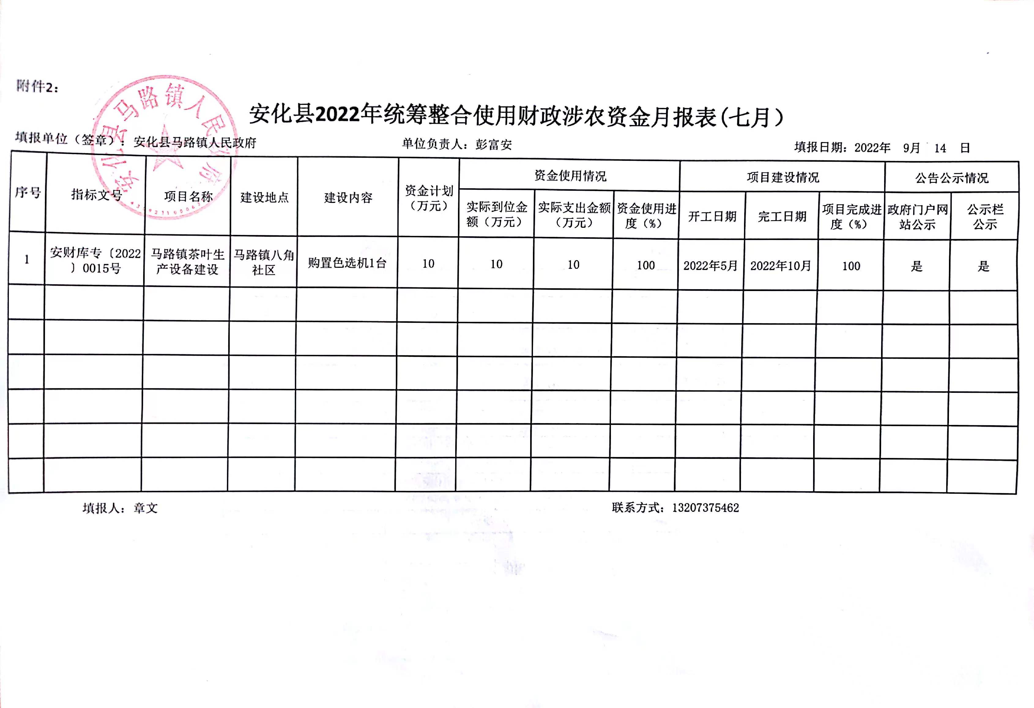 马路镇2022年统筹整合使用财政涉农资金报表(七月)