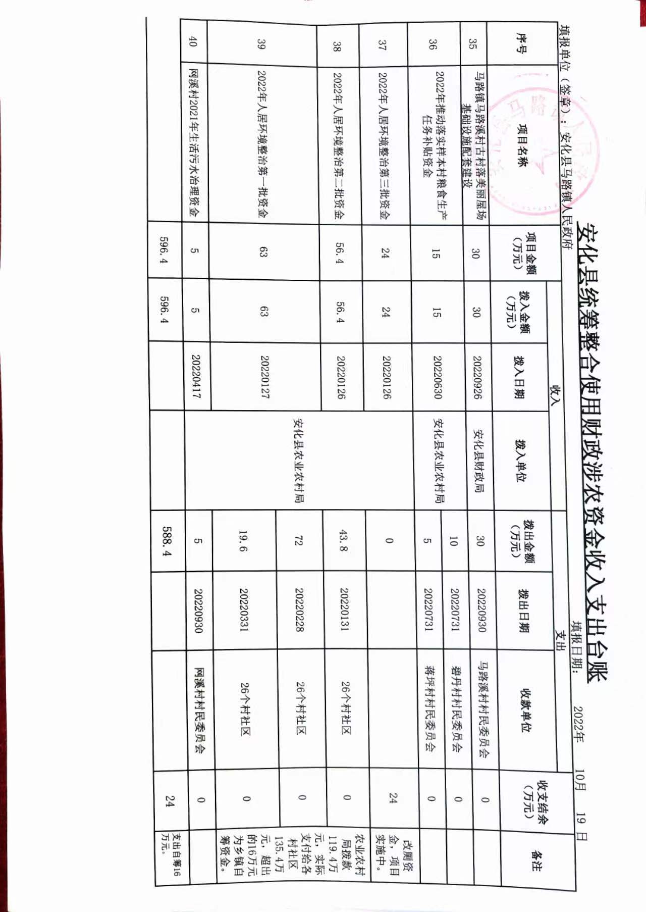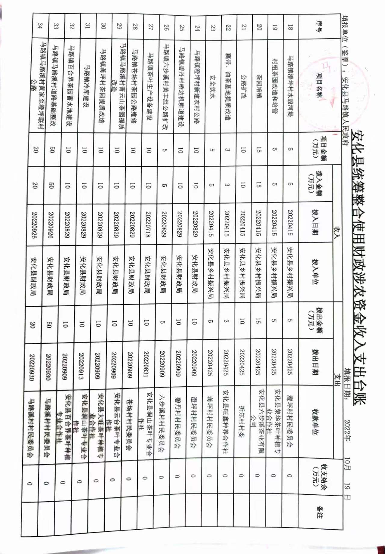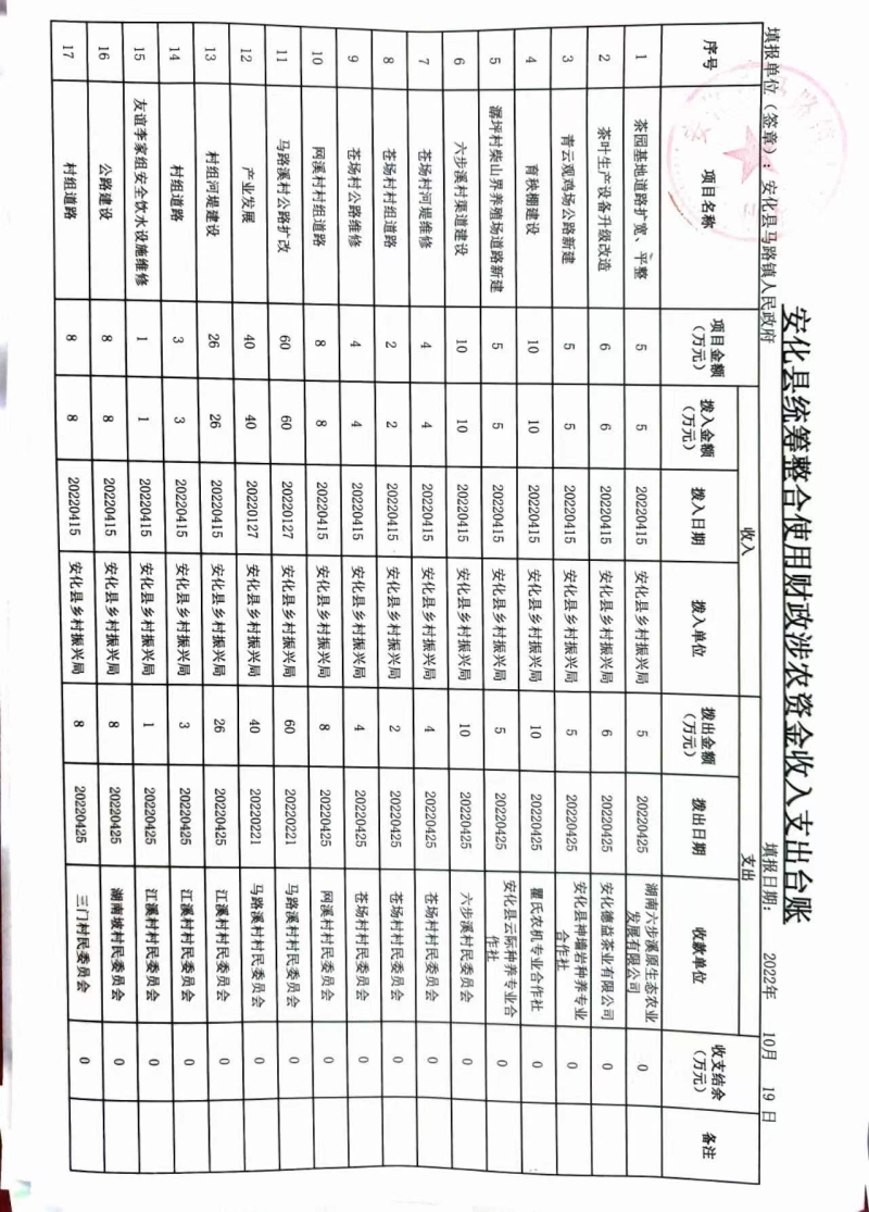 2022年安化县马路镇人民政府统筹整合财政涉农资金收支明细表