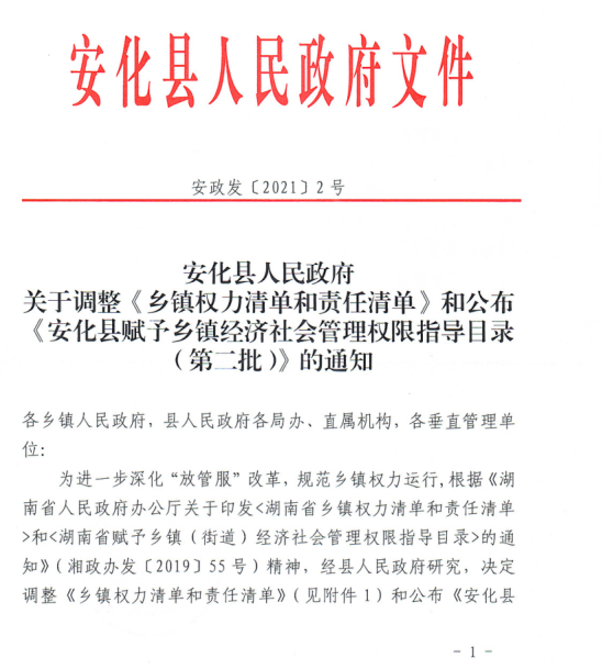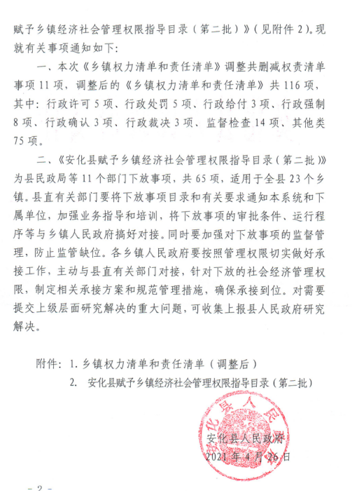 安化县人民政府关于调整《乡镇权力清单和责任清单》和公布《安化县赋予乡镇经济社会管理权限指导目录(第二批)》的通知
