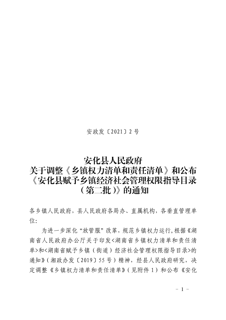 关于调整《乡镇权力清单和责任清单》和公布《安化县赋予乡镇经济社会管理权限指导目录(第二批)》的通知