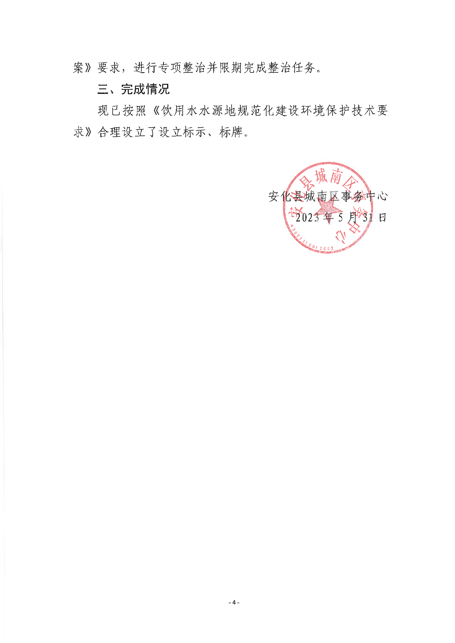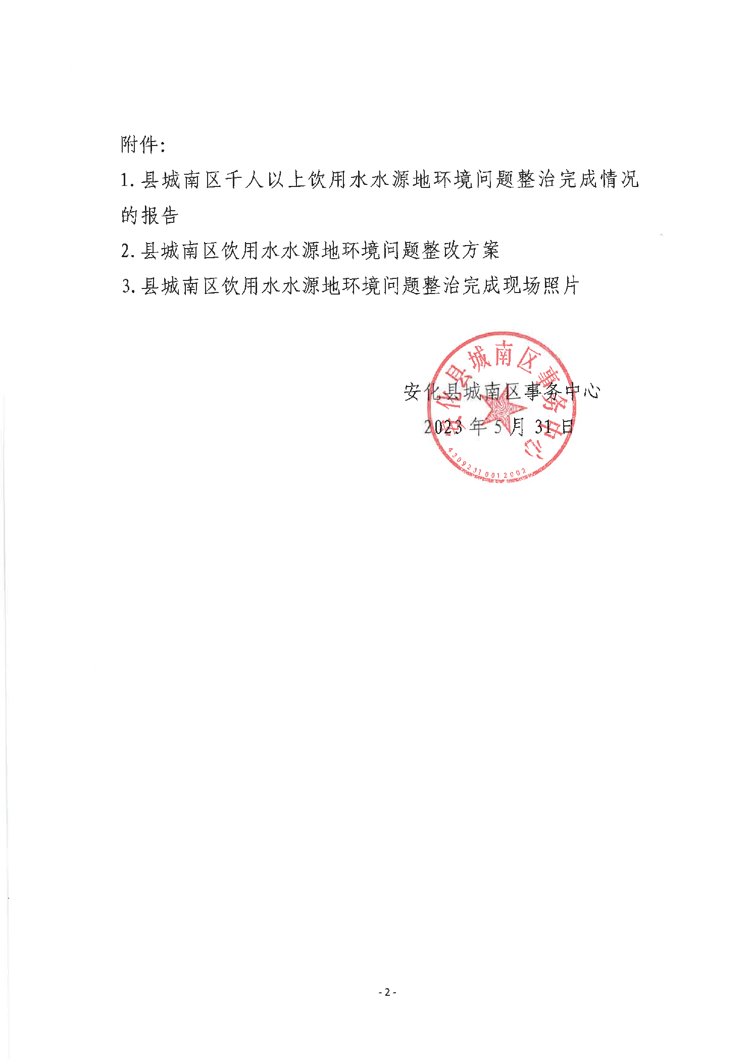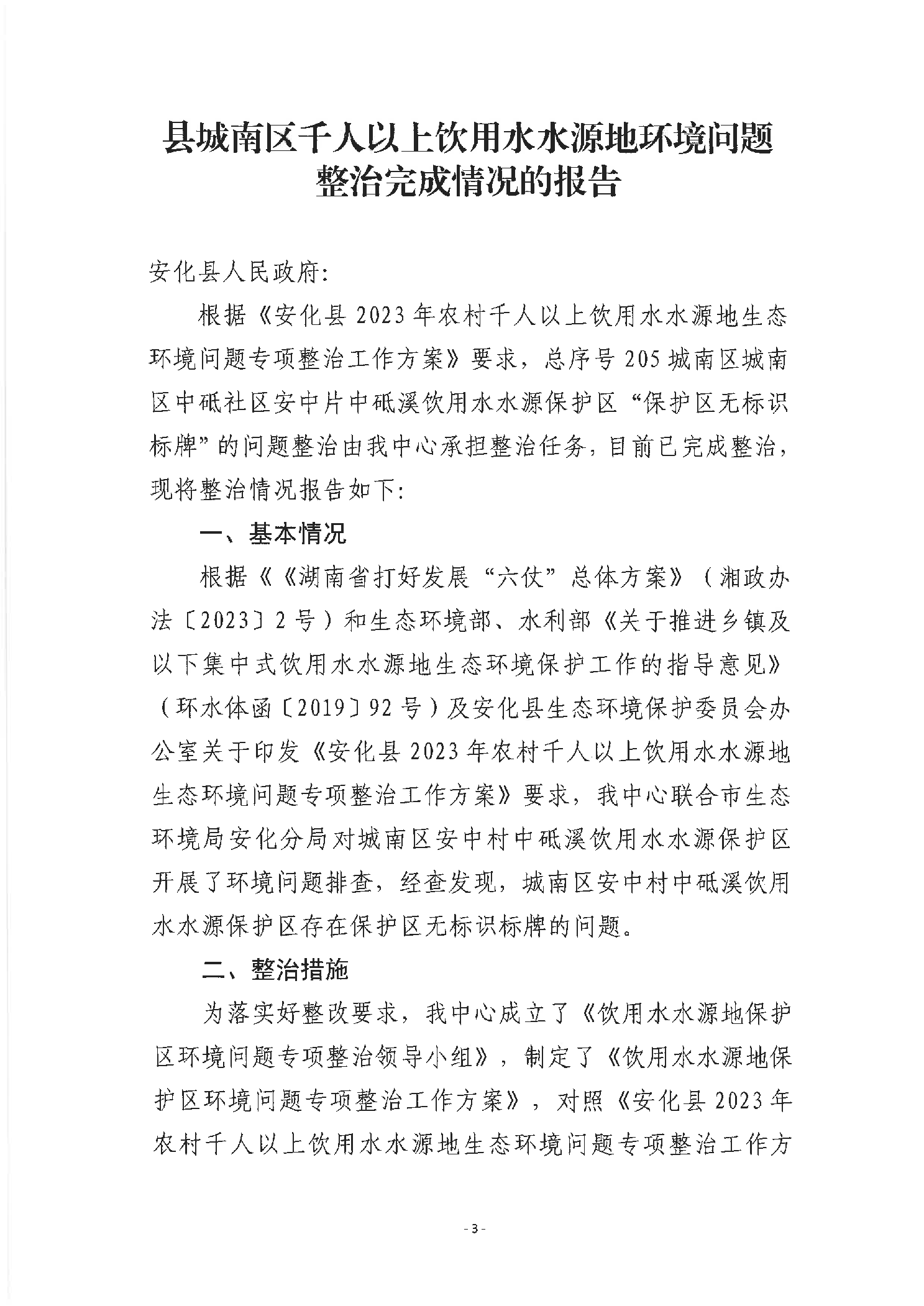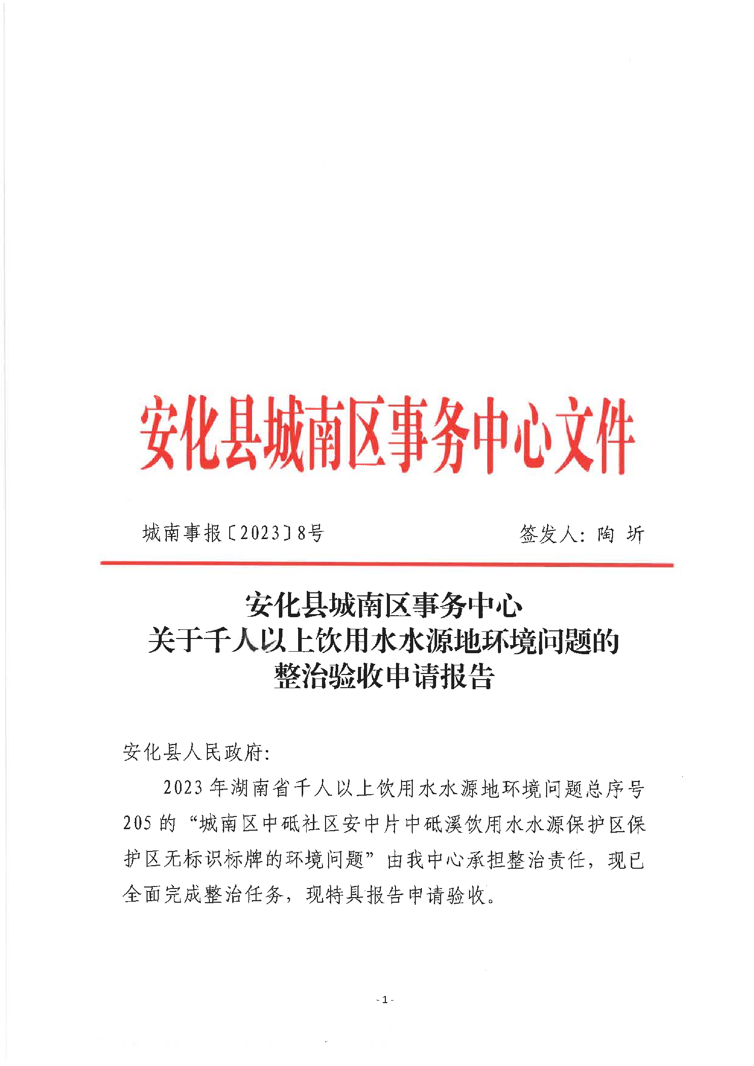 安化县城南区事务中心 关于千人以上饮用水水源地环境问题的 整治验收申请报告