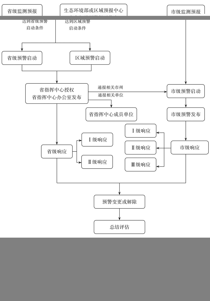 重点区域启动橙色或红色预警,区域外有4个城市同时达到橙色以上预警条件时,启动橙色或红色省级预警,重点区域和区域外相关城市同步启动相应级别预警。