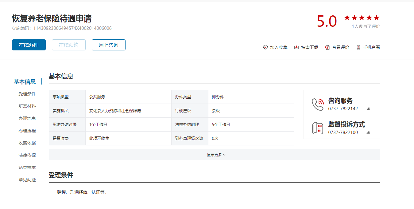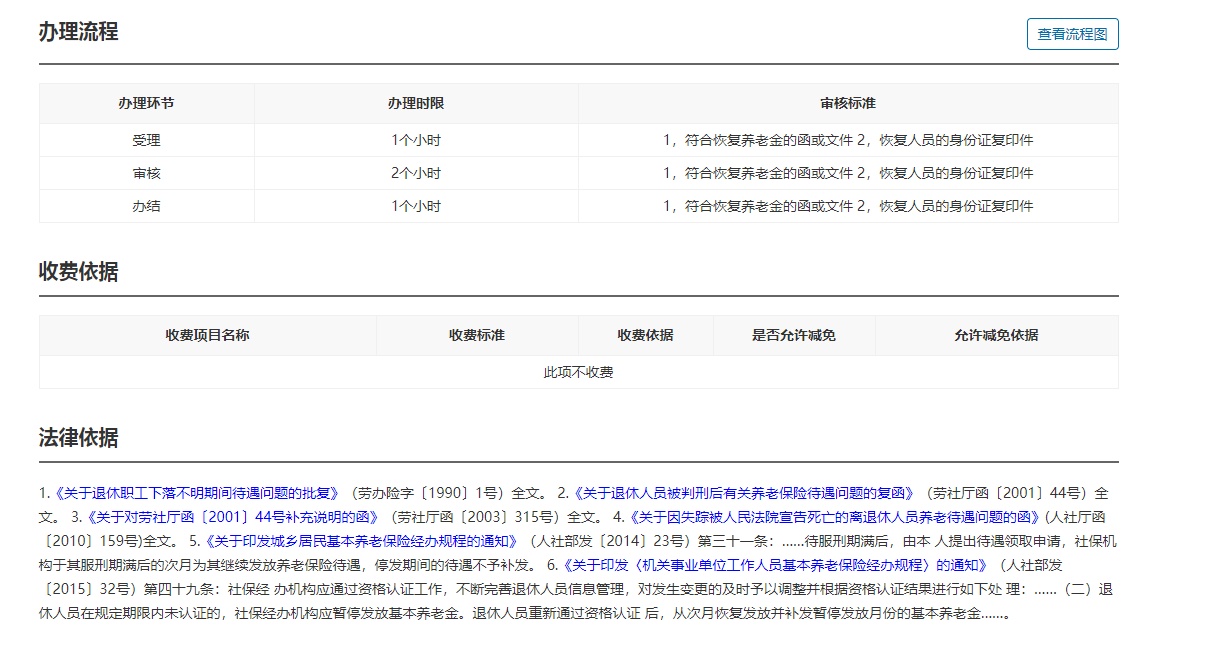 | 一级事项 | 养老保险服务 | 二级事项 | 恢复养老保险待遇申请 |