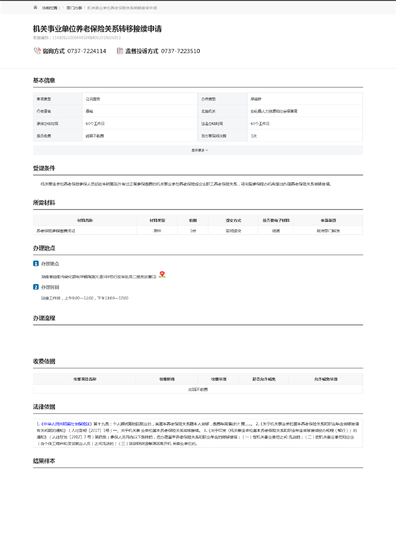 | 一级事项 | 养老保险服务 | 二级事项 | 机关事业单位养老保险关系转移接续申请 |