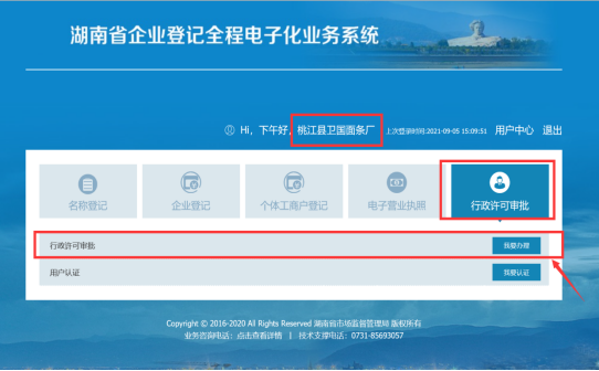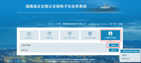 第二步:选择业务办理。输入“验证码”之后,即可正常登录企业登记全程电子化业务系统,选择“行政许可审批”,再点击“我要办理”就可以进入。