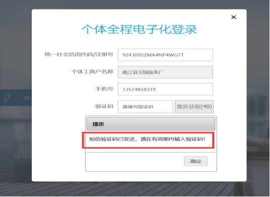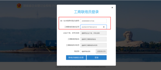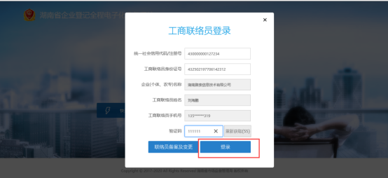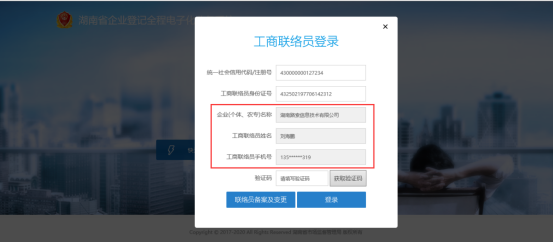 方式二:以“联络员”身份登录(主要适用于企业) 输入企业统一社会信用代码或注册号、工商联络员身份证号,点旁边空白处,系统自动获取企业名称、工商联络员姓名及工商联络员手机号,点击获取验证码,将有验证码短信发至联络员手机上,在页面上输入正确的验证码后登录即可。
