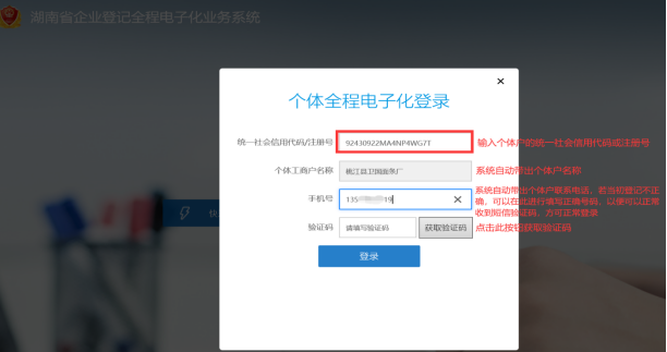 实例一:以食品生产加工作坊许可证变更为例 名 称:桃江县卫国面条厂 统一社会信用代码:92430922MA4NP4WG7T 第一步:登录。选择“个体全程电子化登录”。