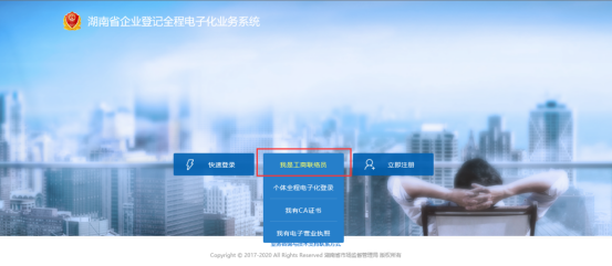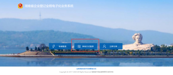 第二章 具体操作指南一、登录系统1. 从湖南省企业登记全程电子化业务系统登录在浏览器地址栏中输入http://222.240.225.75:8004/bsdt/,进入“湖南省企业登记全程电子化业务系统”主界面,点击“登录”,选择用【其他方式登录】。