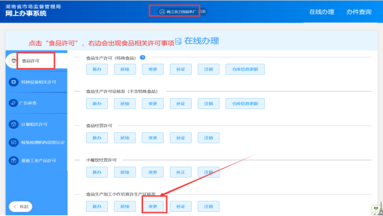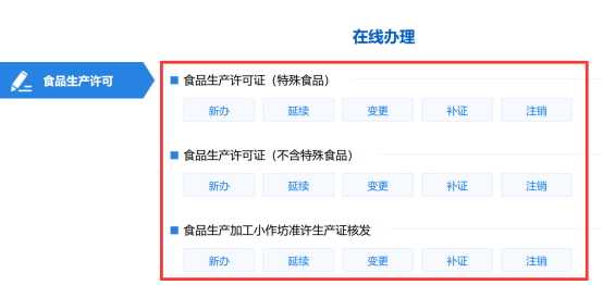 点击“在线办理”后系统会自动跳转到省市场监管局的统一行政许可平台系统(食品生产许可)页面(如下图),选择相应的业务类型即可正常办理。