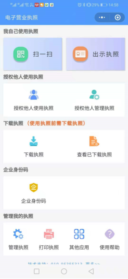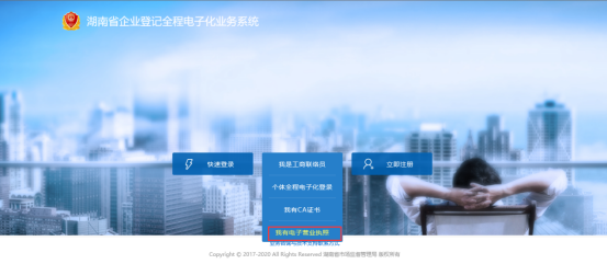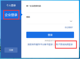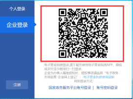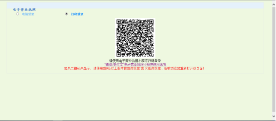 方式三:电子营业执照登录(企业和个体工商户都适用) 1、使用该功能时,请确保已经在手机微信APP或支付宝APP已经安装 “电子营业执照”小程序并且领用电子营业执照。 2、如果尚未领取电子营业执照,请公司法定代表人在微信APP或支付宝APP上打开“电子营业执照”小程序后下载电子营业执照。可以在微信APP/发现/小程序中,输入“电子营业执照”搜索安装微信版“电子营业执照”,或者用微信扫“微信电子营业执照二维码”安装微信版“电子营业执照”;也可以在支付宝APP/朋友/小程序中,输入“电子营业执照”搜索安装支付宝版“电子营业执照”,或者用支付宝扫“支付宝电子营业执照二维码”安装支付宝版“电子营业执照”。安装“电子营业执照”小程序后,请用小程序中的“下载执照”,对法定代表人本人实名认证后,下载电子营业执照。 3、如果不是法定代表本人,可以由法定代表人使用“电子营业执照”小程序的证照管理员指定负责人下载电子营业执照,指定负责人同样可以在手机微信APP或支付宝APP的安装 “电子营业执照”小程序,然后用小程序中的“下载执照”,对负责人实名认证后,下载电子营业执照。