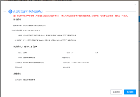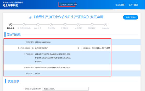 第四步:系统自动关联个体工商户的许可证信息,根据所选择的变更事项进行相应的修改。如果原许可证相关信息不完整,系统会自动提示补充完整并进行相关的校验提示,按系统的提示填报完成,最后点击提交即可。