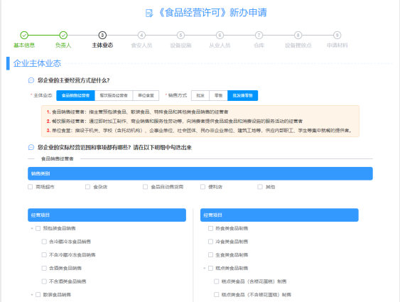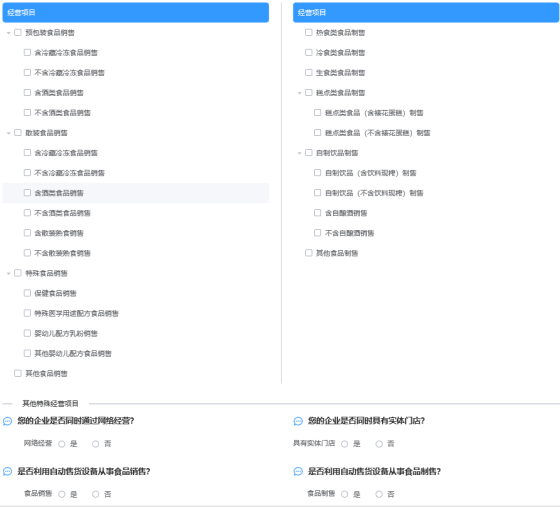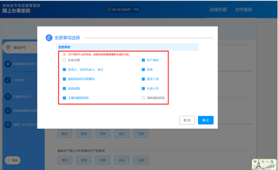 第三步:选择具体的“食品许可”事项及所需办理的“变更”业务类型,然后从弹出的“变更事项选择”页面选择所需变更事项。